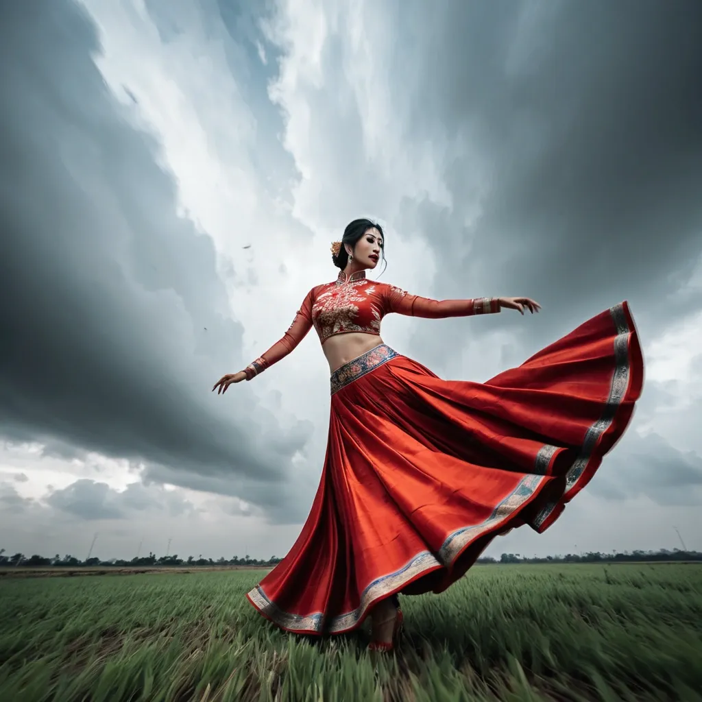 motion blur photography , long range shoot , mysterious cheongsam girl. modern cheongsam style , realistic proportions. dynamic angle perspective , extreme foreshortening , epic pose dramatic perspective. full body , clearly defined edges , wearing a indian traditional chaniya choli , in a surrealistic cloudy dramatic vast expense field , shutter speed 1/15s , dynamic sweeping lines , natural lighting , high-speed movement --ar 9:16 --raw ,