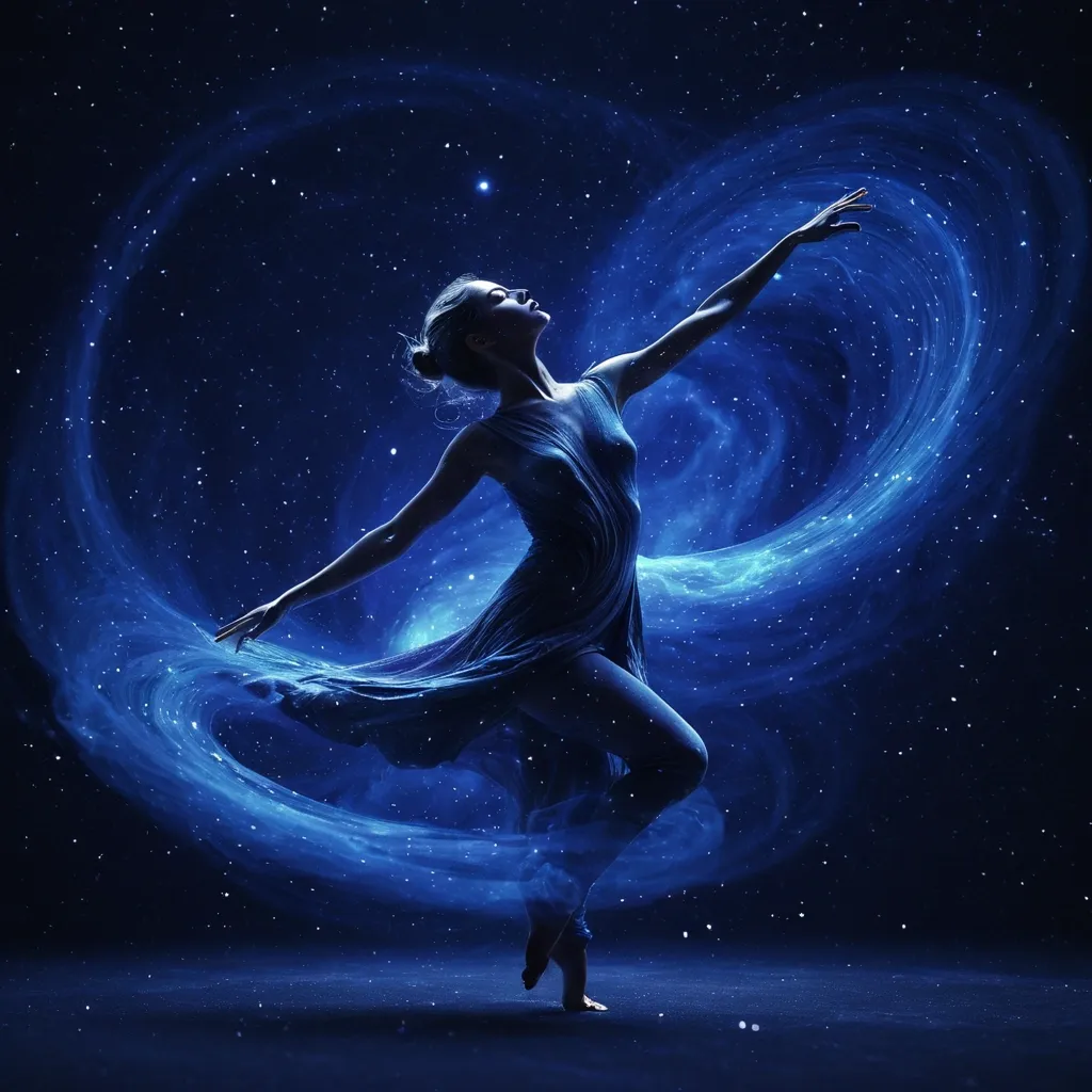 An ethereal dancer in mid-motion , her form dissolving into cosmic dust and light particles against a deep indigo backdrop. Swirling nebulae and distant star clusters create a sense of infinite space. The style blends abstract digital art with elements of minimalism , capturing a profound spiritual essence. Think of the cosmic visuals of James Turrell meets the fluid motion of a classical dancer , rendered with subtle cinematic lighting. ,