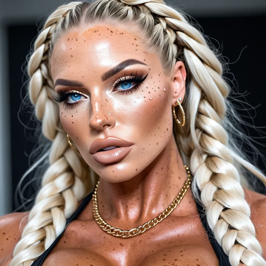 Generate Gorgeous female boss , bimbo , hourglass body , abnormally massive female bodybuilder , gorgeous , close up , full lips , big booty , blonde , freckles on face and breast , braided design hair , feminine silhouette , too big breast , big booty , sexy thighs abs , silhouette , up close , flexing biceps , beautiful blue eyes , legs are iconic and defining physical feature , both visually and in terms of combat ability.wearing an outfit that is a striking blend of elegance , power , and femininity , designed to command attention in any room. The suit is tailored to perfection , hugging the wearer’s curves with precision while emphasizing a structured silhouette. The fabric itself is a refined grey tweed patterned with subtle white grid lines , giving the suit a texture that feels both sophisticated and modern. The blazer features broad blue lapels and gold button accents , adding a luxurious touch that elevates the look beyond typical business attire. The matching high-waisted trousers elongate the frame , further enhancing the poised and commanding effect of the ensemble.The styling choices amplify the boldness of the suit. The inner blouse is a silky , greybutton-down shirt that complements the tweed’s tone while introducing a softer , feminine balance to the sharp tailoring of the jacket. The blouse peeks out neatly from under the blazer , maintaining elegance without drawing focus away from the suit’s commanding cut. Accessories are kept minimal yet intentional: a delicate layered gold necklace and hoop earrings that add glimmers of light and luxury without overpowering the outfit. The choice of voluminous , honey-brown braids cascading down her shoulders frames the face with both confidence and glamour , completing the commanding visual.Altogether , this look communicates a blend of authority and allure. It is business-ready yet fashion-forward , balancing corporate structure with vibrant femininity. The color palette blue , grey and gold avoids being overly delicate , instead embracing the richness of texture , structure , and presence. This is the kind of ensemble that speaks to ambition , sophistication , and personal style—ideal for someone who thrives in positions of influence but insists on expressing her individuality with bold elegance. It’s not just clothing—it’s a statement of power wrapped in grace. In luxury living legs that could crush a watermelon , skirt high boots are a bold and striking statement piece , crafted in glossy black patent leather that gives them a sleek , polished finish. Rising to just below the knee , the boots feature three adjustable buckle straps along the shaft , adding both edge and detail to their design. The towering stiletto heel , paired with a thick platform sole , creates an ultra-dramatic silhouette that elongates the leg and exudes power and confidence. With their combination of shine , height , and structure , these boots perfectly balance fierce femininity with high-fashion allure. Light-reflecting blue eyes , freckles , nose-ring ,