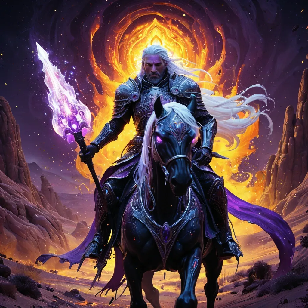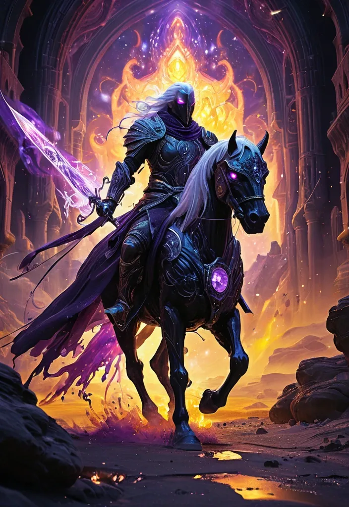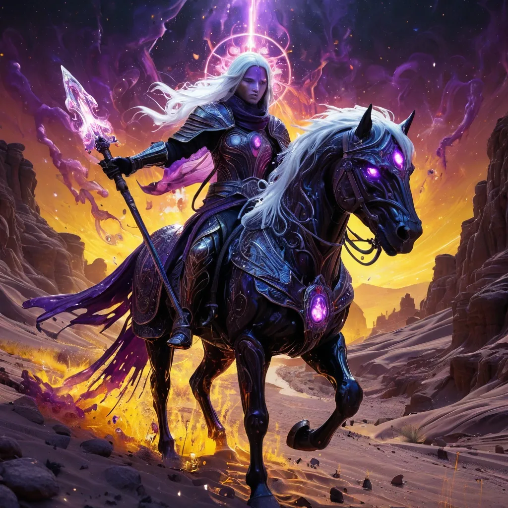 A templar with glory armor , glowing eyes of cosmic flames riding a black horse with glowing eyes of cosmic flames and white hair holding a fiery mystical sword riding through a desert battlefield engulfed in magical energy followed by a beauty templar with glowing eyes radiating with ethereal energy riding on a white horse with glowing eyes radiating with ethereal energy with dark purple hair , magical atmosphere , cosmic effects , ultra detailed , mystical inspired , a masterpiece , 8k resolution , dark fantasy concept art , by Greg Rutkowski , dynamic lighting , hyper-detailed , intricately detailed , Splash screen art , trending on Artstation , deep colour , Unreal Engine , volumetric lighting , Alphonse Mucha , Jordan Grimmer , purple and yellow complementary colours , graffiti art , splash art , street art , spray paint , oil gouache melting , acrylic , high contrast , colourful polychromatic , ultra detailed , ultra quality , CGSociety , Hyperrealistic , splash art , concept art , mid shot , intricately detailed , colour depth , dramatic , 2/3 face angle , side light , colourful background ,