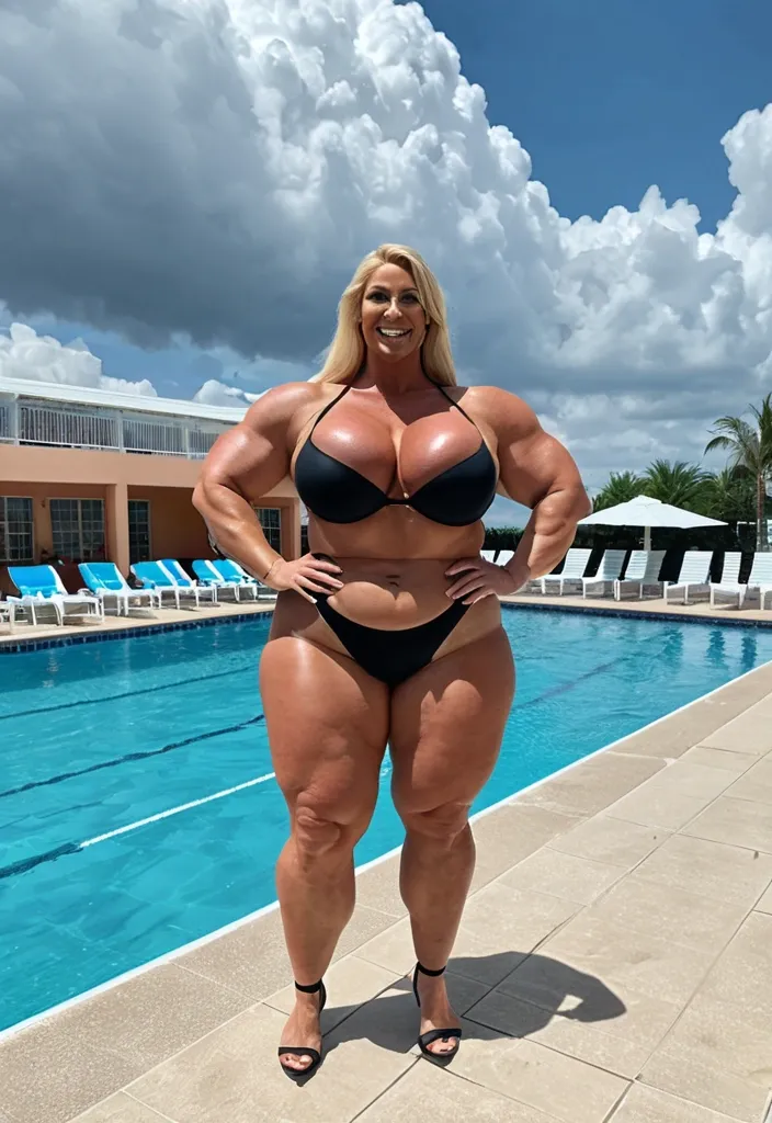smiling 10 ft tall , huge , voluminous and thick blonde muscular overweight first grade girl , with very long and big legs , bigger than the teacher , standing at pool under the clouds ,