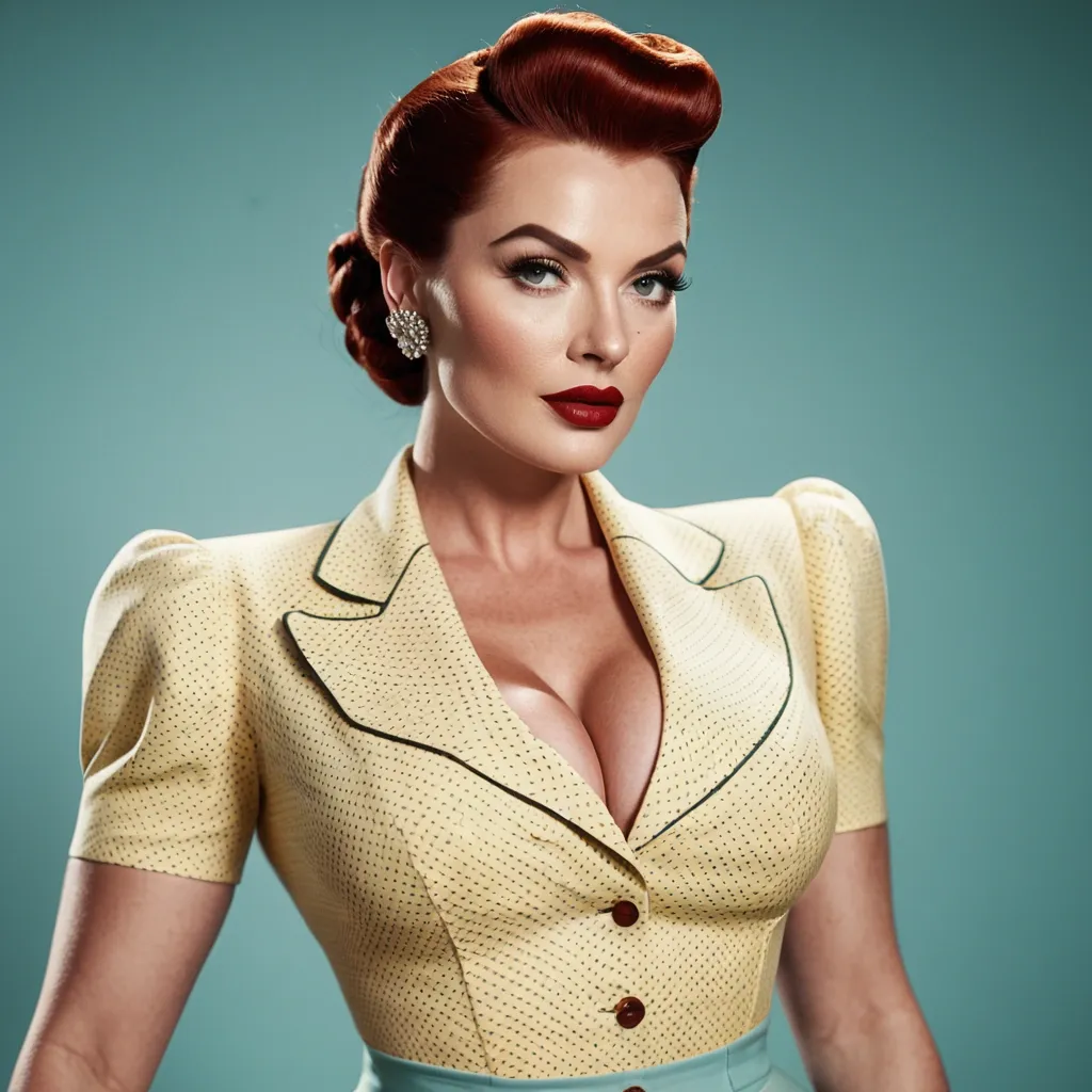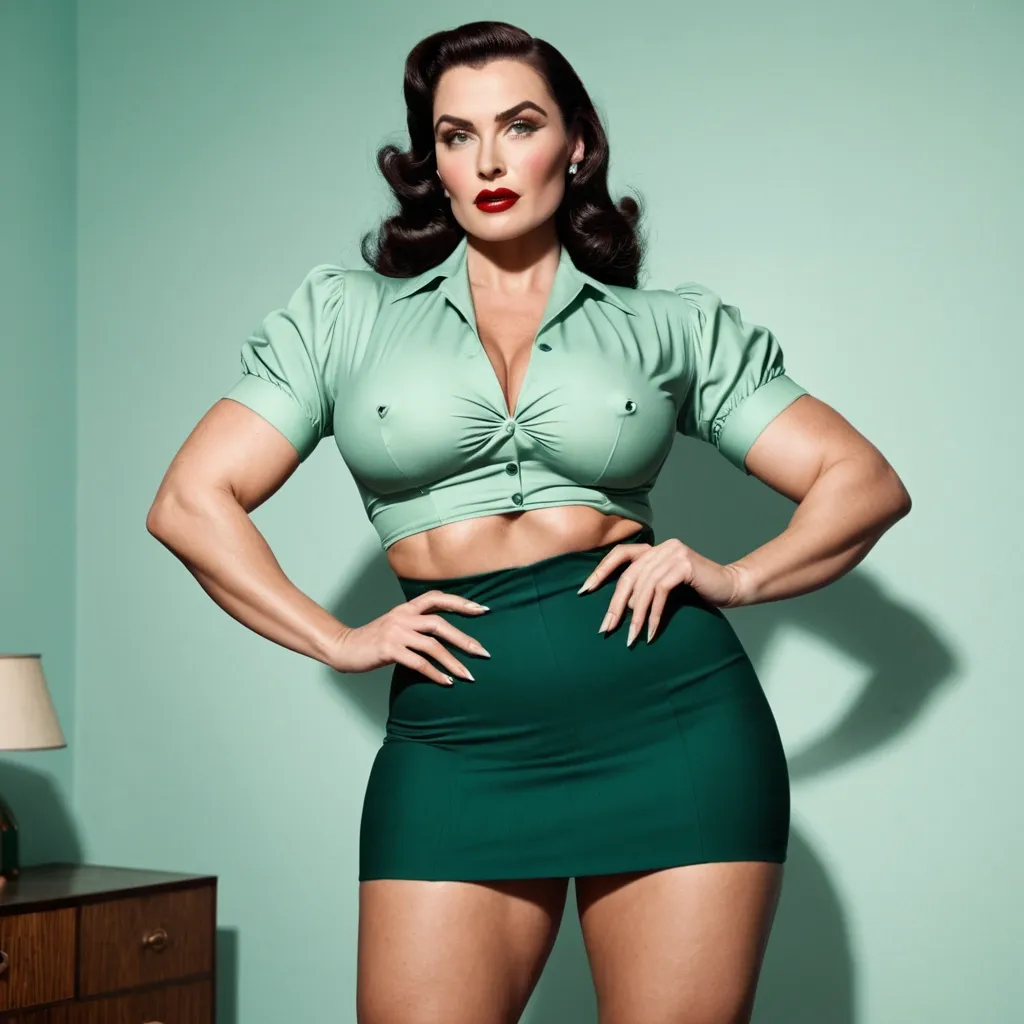 Her faceShe has a strong , symmetrical face with a defined jawline and high cheekbones.Her skin is fair with light freckles , giving her a natural , slightly vintage look.Eyes are light-colored (blue-green) , sharp and focused , with well-shaped eyebrows.Nose is straight and refined.Lips are full , with natural-toned lipstick.Overall expression is calm , confident , and serious — almost like a classic 1940s film actress.Her body•She has a curvy , hourglass figure with a narrow waist and wider hips.•Her build looks strong but feminine , not skinny — more of a fit , full , and shapely physique.•Chest is full , waist is tight , and hips/thighs are wide , giving a very balanced silhouette.•Posture is upright and confident , shoulders back , standing with control.⸻Hairstyle•Hair color is deep red / auburn.•Styled in a vintage 1940s-inspired wave , with volume on top and a smooth , sculpted curl pattern.•The hair is pulled back into a long , thick braided ponytail that rests over her shoulder.•The style looks neat , elegant , and very intentional — not casual.⸻Clothing•Top:•A fitted , button-up blouse with a floral pattern (yellow and green on light fabric).•The blouse is tight around the waist and chest , giving a classic retro silhouette.•Sleeves are short , and the collar is open slightly at the top.•Bottom:•High-waisted light blue pants , very fitted through the hips and thighs.•The high waist emphasizes her hourglass shape.•Fabric looks smooth and tailored , similar to retro or pin-up style clothing.•Accessories:•Gold drop earrings.•Light makeup with eyeliner and soft lipstick.⸻Overall vibeShe looks like a mix of:•1940s / 1950s pin-up style•modern fitness/curvy model•confident , elegant , strong woman•clean , classy , not flashyGenerate Gorgeous female boss , bimbo , hourglass body , abnormally massive female bodybuilder , gorgeous , close up , full lips , big booty , redheaded , freckles on face and breast , feminine silhouette , too big breast , big booty , sexy thighs abs , silhouette , up close , flexing biceps , beautiful green eyes , legs are iconic and defining physical feature , both visually and in terms of combat ability.wearing an outfit that is a striking blend of elegance , power , and femininity , designed to command attention in any room. The suit is tailored to perfection , hugging the wearer’s curves with precision while emphasizing a structured silhouette. The fabric itself is a refined grey tweed patterned with subtle white grid lines , giving the suit a texture that feels both sophisticated and modern. The blazer features broad blue lapels and gold button accents , adding a luxurious touch that elevates the look beyond typical business attire. The matching high-waisted trousers elongate the frame , further enhancing the poised and commanding effect of the ensemble.The styling choices amplify the boldness of the suit. The inner blouse is a silky , greybutton-down shirt that complements the tweed’s tone while introducing a softer , feminine balance to the sharp tailoring of the jacket. The blouse peeks out neatly from under the blazer , maintaining elegance without drawing focus away from the suit’s commanding cut. Accessories are kept minimal yet intentional: a delicate layered gold necklace and hoop earrings that add glimmers of light and luxury without overpowering the outfit. The choice of voluminous , frames the face with both confidence and glamour , completing the commanding visual.Altogether , this look communicates a blend of authority and allure. It is business-ready yet fashion-forward , balancing corporate structure with vibrant femininity. The color palette blue , grey and gold avoids being overly delicate , instead embracing the richness of texture , structure , and presence. This is the kind of ensemble that speaks to ambition , sophistication , and personal style—ideal for someone who thrives in positions of influence but insists on expressing her individuality with bold elegance. It’s not just clothing—it’s a statement of power wrapped in grace. In luxury living legs that could crush a watermelon , skirt high boots are a bold and striking statement piece , crafted in glossy black patent leather that gives them a sleek , polished finish. Rising to just below the knee , the boots feature three adjustable buckle straps along the shaft , adding both edge and detail to their design. The towering stiletto heel , paired with a thick platform sole , creates an ultra-dramatic silhouette that elongates the leg and exudes power and confidence. With their combination of shine , height , and structure , these boots perfectly balance fierce femininity with high-fashion allure. lips , big booty , redheaded , freckles on face and breast , braided design hair , feminine silhouette , too big breast , big booty , sexy thighs abs , silhouette , up close , flexing biceps , beautiful green eyes , legs are iconic and defining physical feature , both visually and in terms of combat ability. Massive breast , 1940s vintage blouse , linen skirt , in home playing a record , small waist , curvy hips , massive breast , big round booty ,