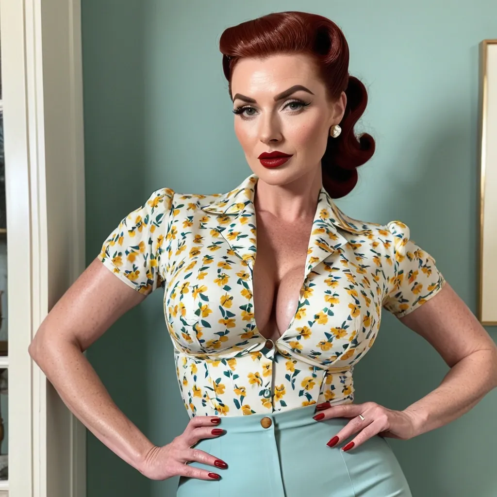Face•She has a strong , symmetrical face with a defined jawline and high cheekbones.•Her skin is fair with light freckles , giving her a natural , slightly vintage look.•Eyes are light-colored (blue-green) , sharp and focused , with well-shaped eyebrows.•Nose is straight and refined.•Lips are full , with natural-toned lipstick.•Overall expression is calm , confident , and serious — almost like a classic 1940s film actress.⸻Body•She has a curvy , hourglass figure with a narrow waist and wider hips.•Her build looks strong but feminine , not skinny — more of a fit , full , and shapely physique.•Chest is full , waist is tight , and hips/thighs are wide , giving a very balanced silhouette.•Posture is upright and confident , shoulders back , standing with control.⸻Hairstyle•Hair color is deep red / auburn.•Styled in a vintage 1940s-inspired wave , with volume on top and a smooth , sculpted curl pattern.•The hair is pulled back into a long , thick braided ponytail that rests over her shoulder.•The style looks neat , elegant , and very intentional — not casual.⸻Clothing•Top:•A fitted , button-up blouse with a floral pattern (yellow and green on light fabric).•The blouse is tight around the waist and chest , giving a classic retro silhouette.•Sleeves are short , and the collar is open slightly at the top.•Bottom:•High-waisted light blue pants , very fitted through the hips and thighs.•The high waist emphasizes her hourglass shape.•Fabric looks smooth and tailored , similar to retro or pin-up style clothing.•Accessories:•Gold drop earrings.•Light makeup with eyeliner and soft lipstick.⸻Overall vibeShe looks like a mix of:•1940s / 1950s pin-up style•modern fitness/curvy model•confident , elegant , strong woman•clean , classy , not flashy lips , big booty , redheaded , freckles on face and breast , braided design hair , feminine silhouette , too big breast , big booty , sexy thighs abs , silhouette , up close , flexing biceps , beautiful green eyes , legs are iconic and defining physical feature , both visually and in terms of combat ability. Massive breast , massive cleavage , Freckles , plump lips , enormous breast , Powerful , hourglass silhouette , enormous butt. On back yard porch ,