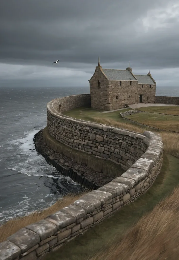 Burghead , Iron Age promontory fort on the Moray Firth , stone ramparts overlooking gray northern sea , wooden huts within wind-swept walls , gulls wheeling under overcast sky , late autumn , Style: hyperrealistic with a painterly texture , reminiscent of historical reconstruction art , detailed and atmospheric with subtle depth of field , Wide view , Side View , 4K. ,