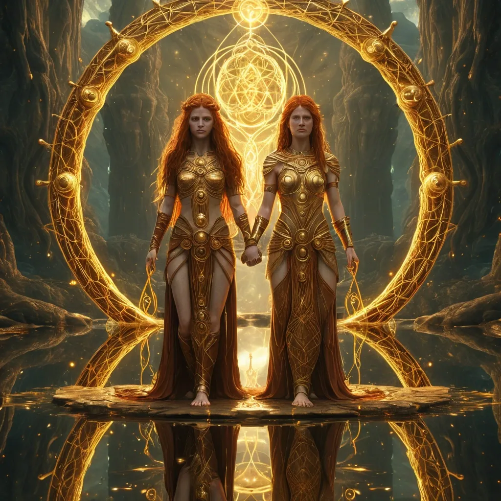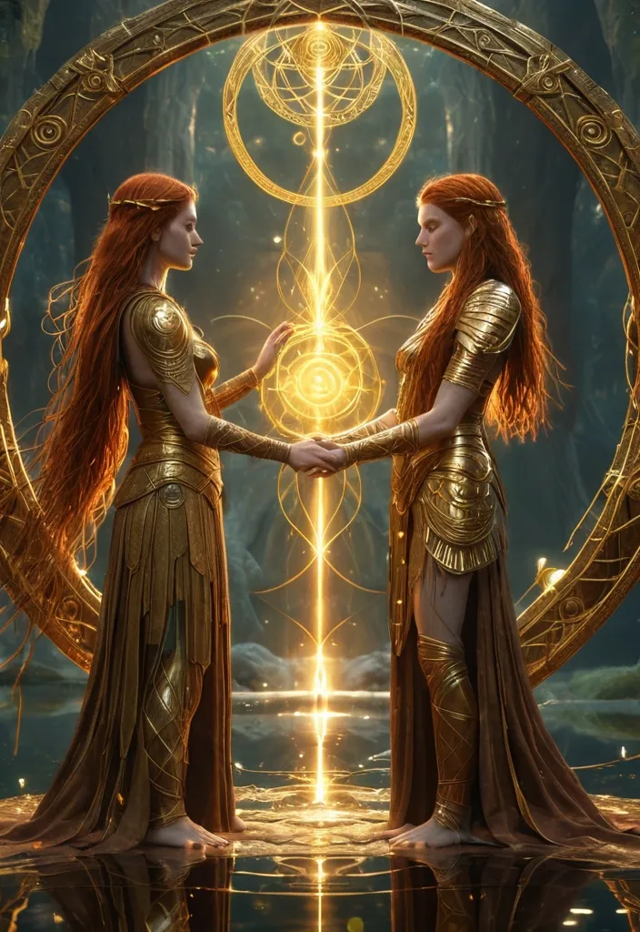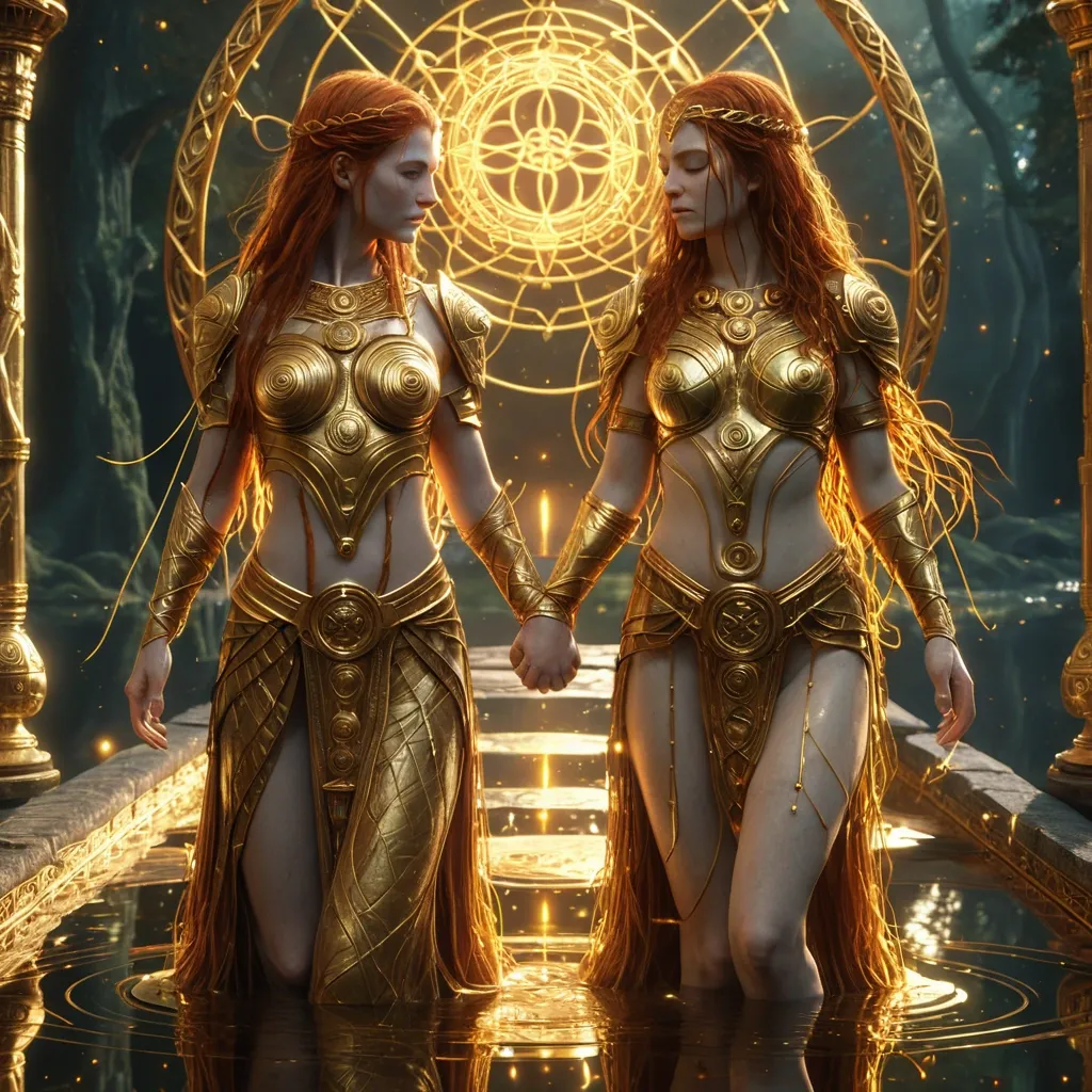 Masterpiece: "sacred mirror temple with epic Hohepriesterin as ancient guardian , Celtic redhead goddes and Celtic brownhaired shamanwarrior holding hands with golden threads as living bridge , mirrors showing cosmic desires beyond personal , breath circulating through golden connection , archetypal truths emerging , fantasy art , emotional sacred testing and cosmic intimacy" octane render , 8k ,