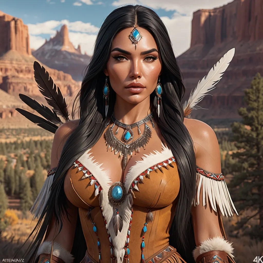 full body portrait photograph of Madison Beer as Pocahontas , young beautiful native american woman , perfect symmetrical face , feather jewelry , traditional handmade dress , armed female hunter warrior , (((wild west))) environment , Utah landscape , ultra realistic , concept art , elegant , ((intricate)) , ((highly detailed)) , depth of field , ((professionally color graded)) , 8k , art by artgerm and greg rutkowski and alphonse mucha , 4k , clean , realistic face , realistic eyes , highest quality , realistic hands , trending on artstation , masterpiece , NSFW , five fingers , make her sexy and hot ,