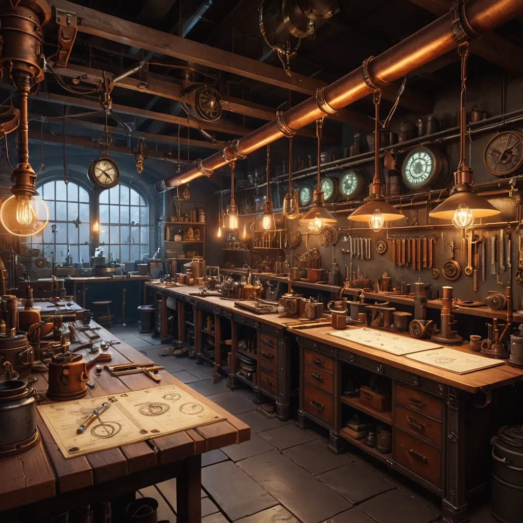 Artificer workshop and guild dormitory combined. Rows of workbenches cluttered with runic tools , glowing crystals , and clock parts , side-by-side with personal bunks , maps , and weapons hung neatly. Copper pipes line the ceiling , steam drifting softly from vents. A small communal kitchen and a round table with tea , notes , and blueprints give it a lived-in feel. Orwen Vale adjusts a mechanical prosthetic arm under lamplight while an apprentice carries parts. Warm amber tones , cozy yet industrious. Camera: slightly elevated corner view showing both workshop and dorm. Style: painterly realism , rich brass and mahogany palette , hints of glowing runes. ,