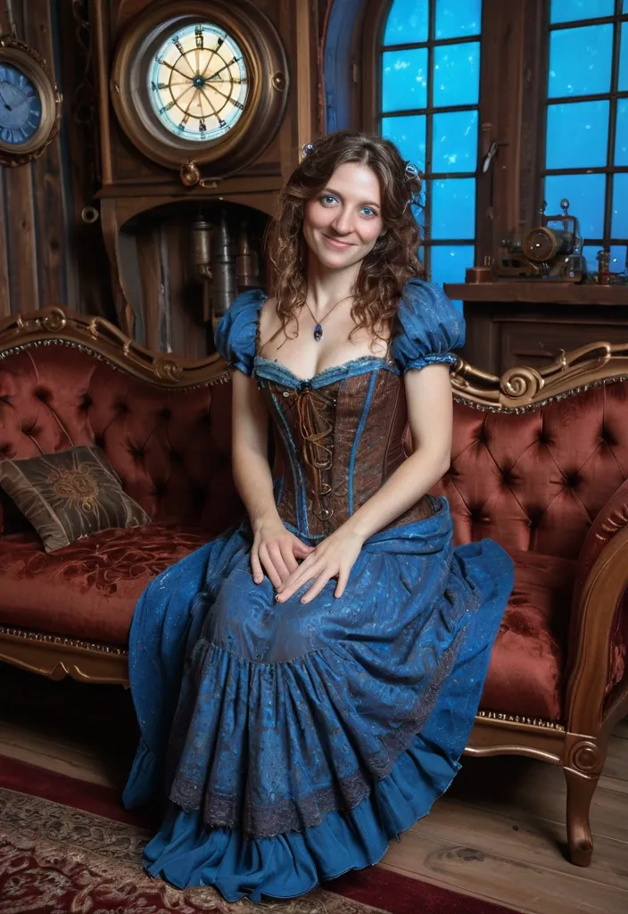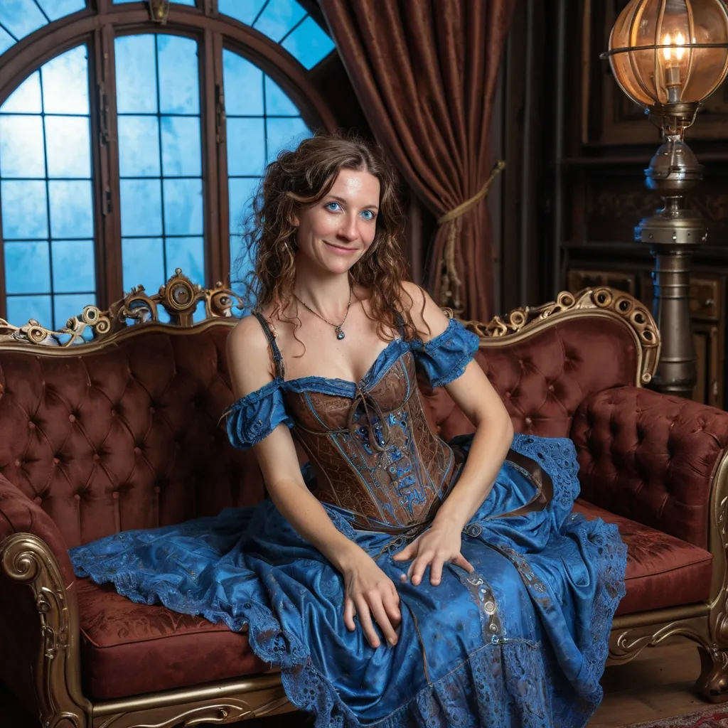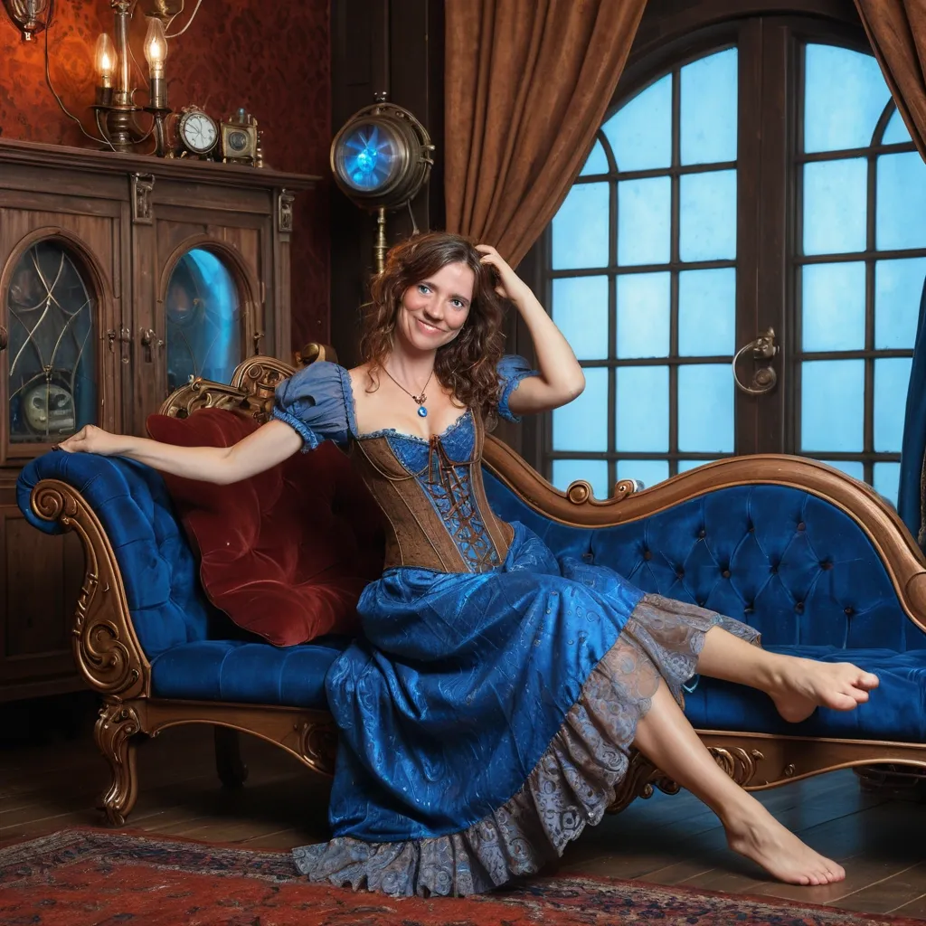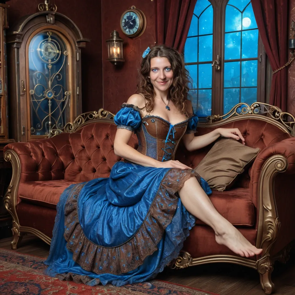 masterpiece photorealistic full-length freckled brown wavy shoulder hair european woman in her mid thirties , wearing blue and bronze corset opened lace steampunk dress , gracefully radiates charm , barefoot. Natural face with natural makeup with expressive , bright blue eyes and a gentle smile. She have her right hand on her hair. she's laying on a red confortable sofa , she is in a wooden steampunk boudoir. we can see a blue moon through a window ,
