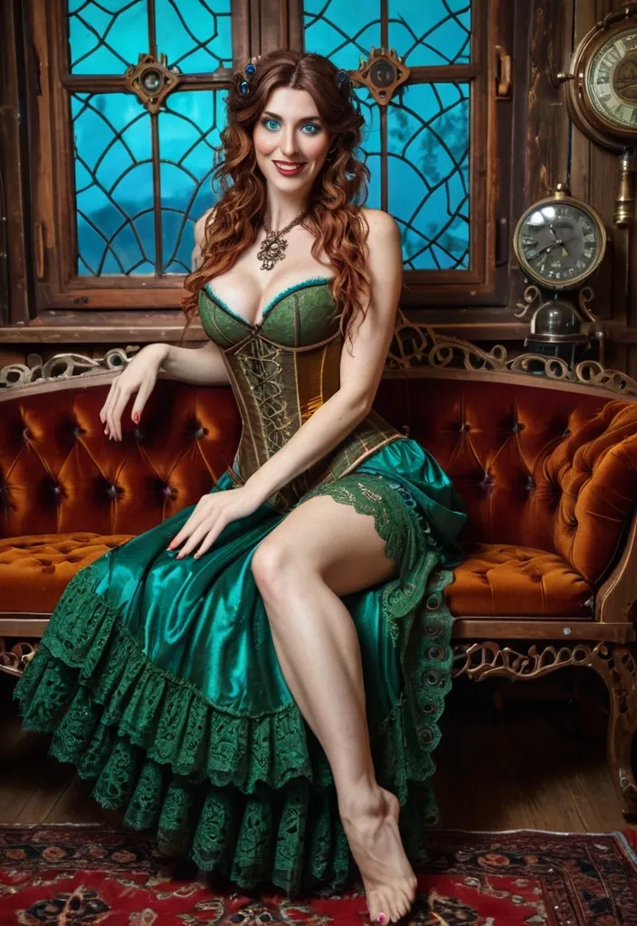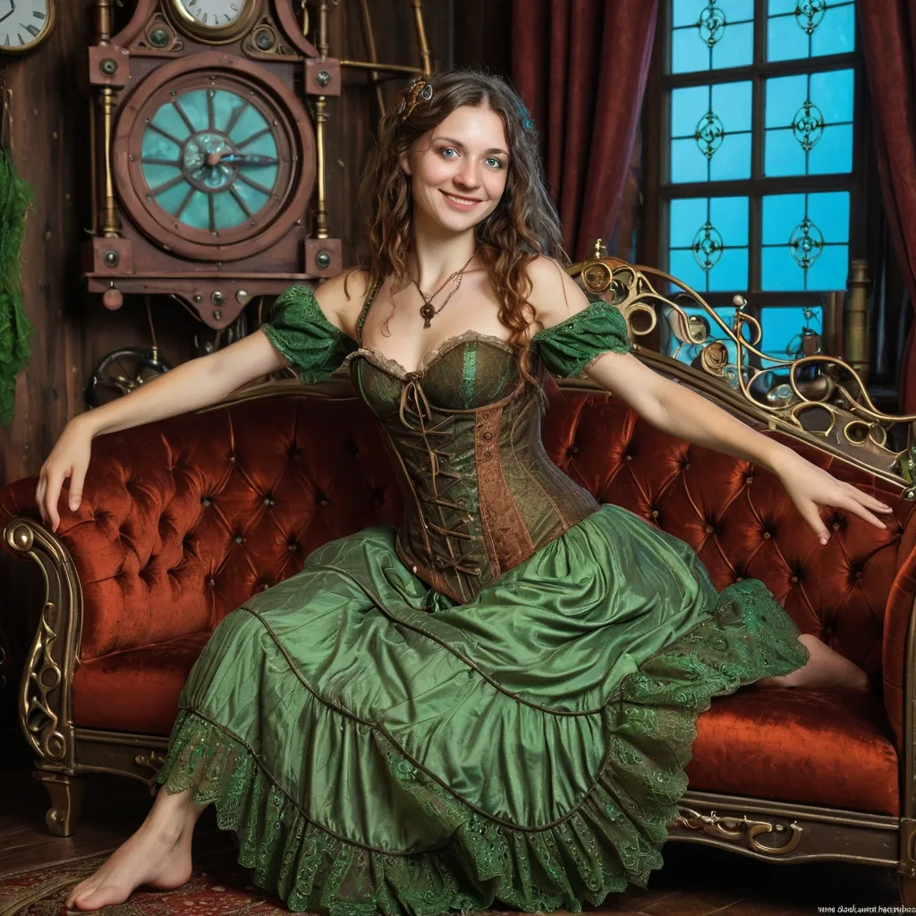 masterpiece photorealistic full-length freckled brown wavy shoulder hair european woman in her mid twenties , wearing green and bronze corset opened lace steampunk dress , gracefully radiates charm , barefoot. Natural face , small nose , with natural makeup with expressive , bright blue eyes and a gentle smile. She have her right hand on her hair. she's laying on a red confortable sofa , she is in a wooden steampunk boudoir. we can see a blue moon through a window ,