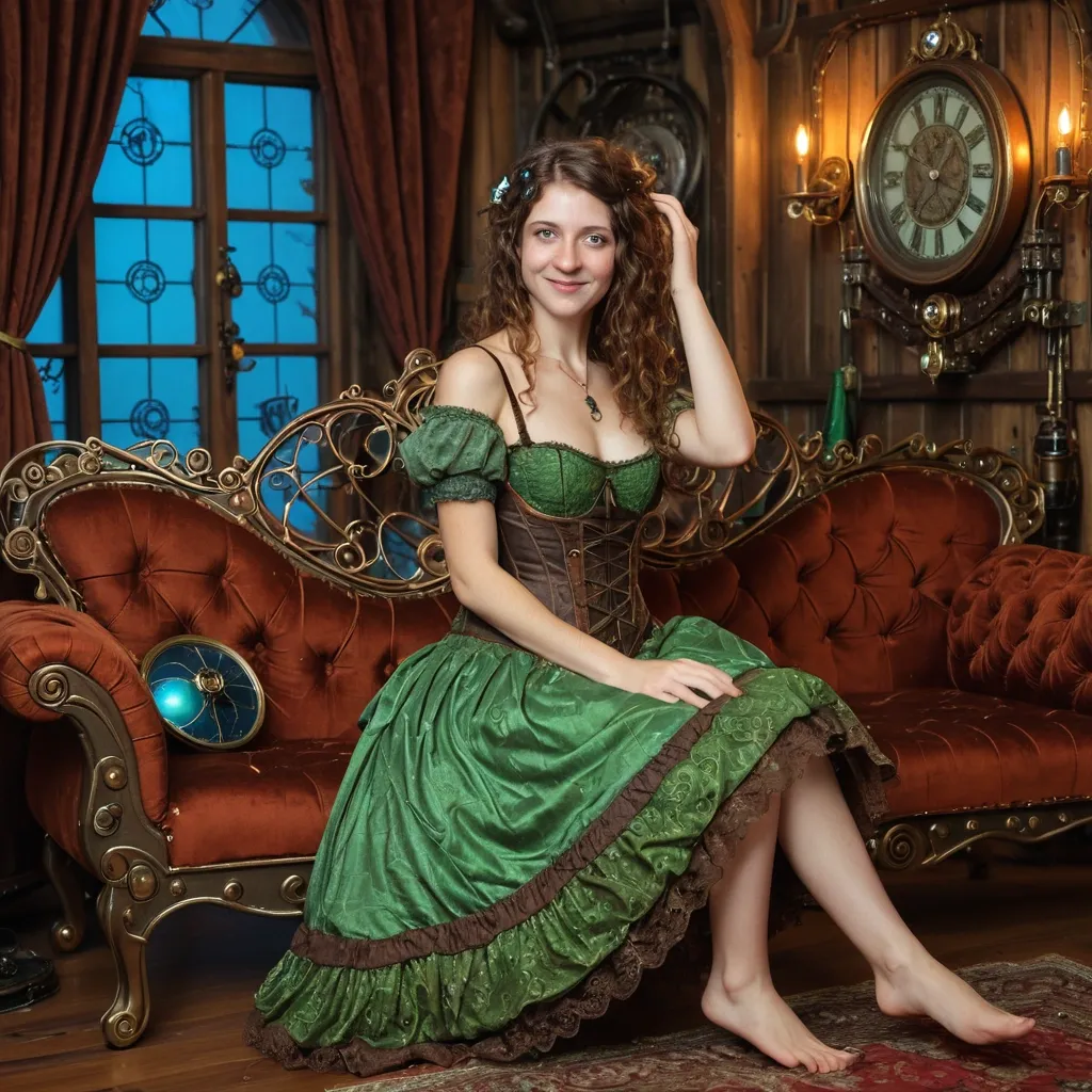 masterpiece photorealistic full-length freckled brown wavy shoulder hair european woman in her mid twenties , wearing green and bronze corset opened lace steampunk dress , gracefully radiates charm , barefoot. Natural beautiful face , , with natural makeup with expressive , bright blue eyes and a gentle smile. She have her right hand on her hair. she's laying on a red confortable sofa , she is in a wooden steampunk boudoir. we can see a blue moon through a window ,