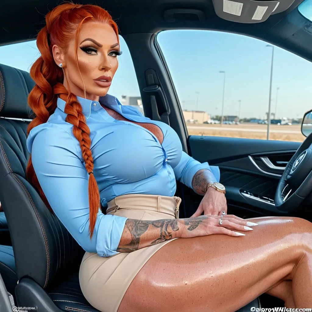 Generate Gorgeous female boss , bimbo , hourglass body , abnormally massive female bodybuilder , gorgeous , close up , full lips , big booty , redheaded , freckles on face and breast , braided design hair , feminine silhouette , too big breast , big booty , sexy thighs abs , silhouette , up close , flexing biceps , beautiful green eyes , legs are iconic and defining physical feature , both visually and in terms of combat ability.wearing an outfit that is a striking blend of elegance , power , and femininity , designed to command attention in any room. The suit is tailored to perfection , hugging the wearer’s curves with precision while emphasizing a structured silhouette. The fabric itself is a refined grey tweed patterned with subtle white grid lines , giving the suit a texture that feels both sophisticated and modern. The blazer features broad blue lapels and gold button accents , adding a luxurious touch that elevates the look beyond typical business attire. The matching high-waisted trousers elongate the frame , further enhancing the poised and commanding effect of the ensemble.The styling choices amplify the boldness of the suit. The inner blouse is a silky , greybutton-down shirt that complements the tweed’s tone while introducing a softer , feminine balance to the sharp tailoring of the jacket. The blouse peeks out neatly from under the blazer , maintaining elegance without drawing focus away from the suit’s commanding cut. Accessories are kept minimal yet intentional: a delicate layered gold necklace and hoop earrings that add glimmers of light and luxury without overpowering the outfit. The choice of voluminous , honey-brown braids cascading down her shoulders frames the face with both confidence and glamour , completing the commanding visual.Altogether , this look communicates a blend of authority and allure. It is business-ready yet fashion-forward , balancing corporate structure with vibrant femininity. The color palette blue , grey and gold avoids being overly delicate , instead embracing the richness of texture , structure , and presence. This is the kind of ensemble that speaks to ambition , sophistication , and personal style—ideal for someone who thrives in positions of influence but insists on expressing her individuality with bold elegance. It’s not just clothing—it’s a statement of power wrapped in grace. In luxury living legs that could crush a watermelon , skirt high boots are a bold and striking statement piece , crafted in glossy black patent leather that gives them a sleek , polished finish. Rising to just below the knee , the boots feature three adjustable buckle straps along the shaft , adding both edge and detail to their design. The towering stiletto heel , paired with a thick platform sole , creates an ultra-dramatic silhouette that elongates the leg and exudes power and confidence. With their combination of shine , height , and structure , these boots perfectly balance fierce femininity with high-fashion allure. Massive breast , , driving and sitting a car , wearing a sky blue oxford shirt , and beige skirtenormous butt ,