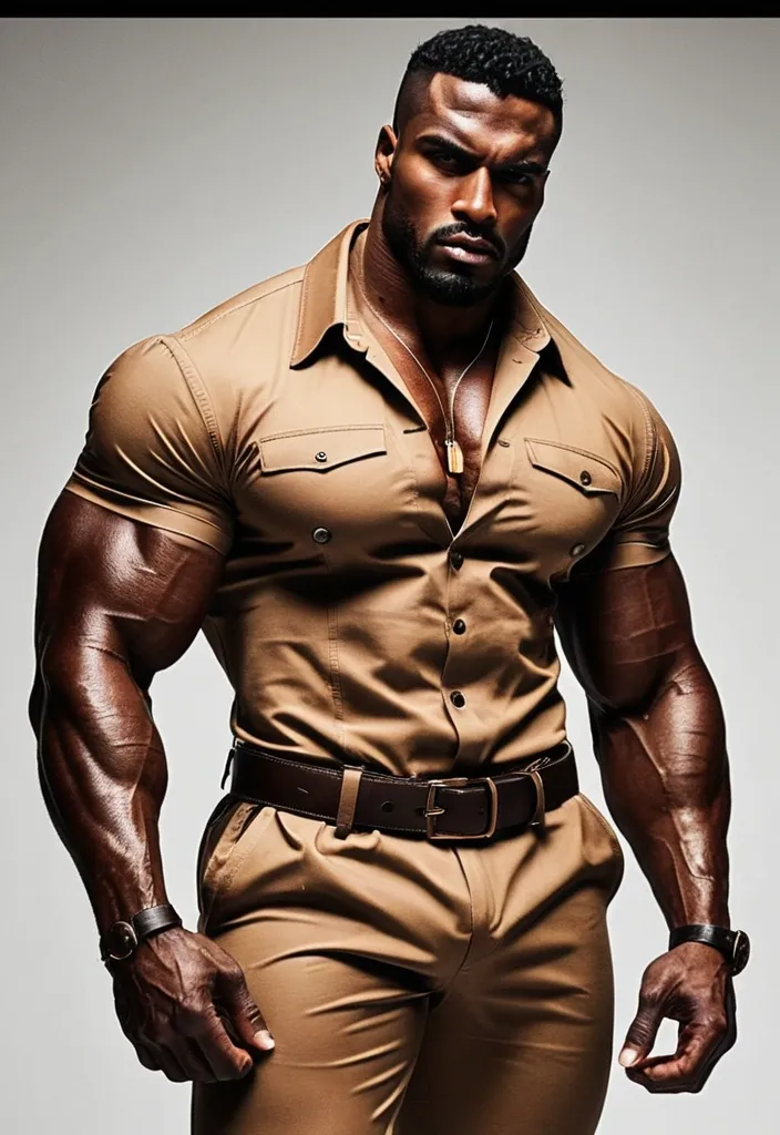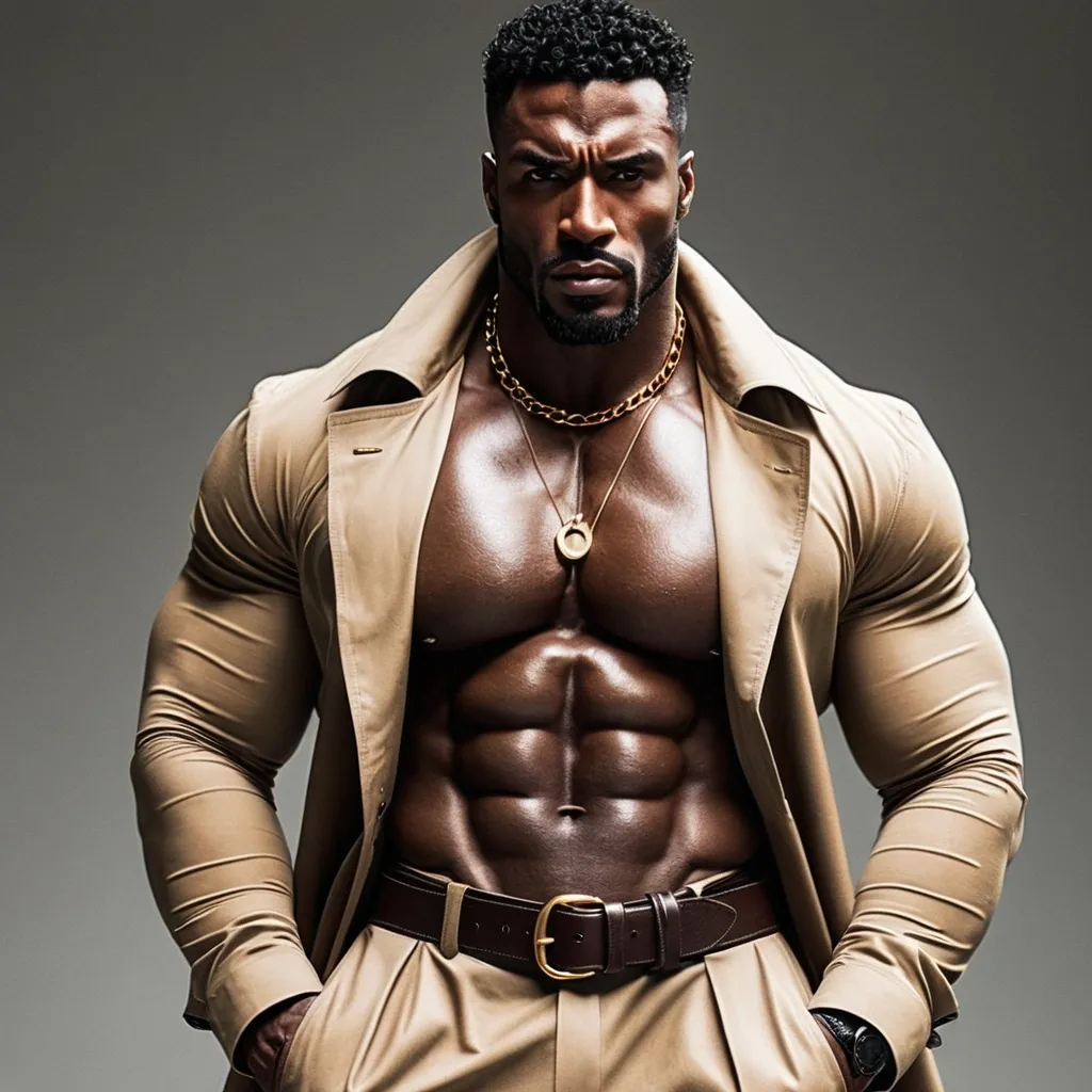 Generate ruggedly handsome dark-skinned African-American man abnormally massive male bodybuilder , , close up , full lips , big booty , black trimmed coarse hair , big , muscular man , brown strikingly intense and alluring eyes , up close , flexing biceps , beautiful brown eyes , legs are iconic and defining physical feature , both visually and in terms of combat ability.wearing an outfit that is a striking blend of elegance , power , and femininity , designed to command attention in any room. The suit is tailored to perfection , hugging the wearer’s curves with precision while emphasizing a structured silhouette. The fabric itself is a refined grey tweed patterned with subtle white grid lines , giving the suit a texture that feels both sophisticated and modern. The blazer features broad blue lapels and gold button accents , adding a luxurious touch that elevates the look beyond typical business attire. The matching high-waisted trousers elongate the frame , further enhancing the poised and commanding effect of the ensemble.The styling choices amplify the boldness of the suit. The inner shirt is a silky , greybutton-down shirt that complements the tweed’s tone while introducing a masculine balance to the sharp tailoring of the jacket. The shirt peeks out neatly from under the blazer , maintaining elegance without drawing focus away from the suit’s commanding cut. Accessories are kept minimal yet intentional: a delicate layered gold necklace ad alpha leader of light and luxury without overpowering the outfit completing the commanding visual.Altogether , this look communicates a blend of authority and allure. It is business-ready yet fashion-forward , balancing corporate structure with vibrant femininity. The color palette blue , grey and gold avoids being overly delicate , instead embracing the richness of texture , structure , and presence. This is the kind of ensemble that speaks to ambition , sophistication , and personal style—ideal for someone who thrives in positions of influence but insists on expressing her individuality with bold elegance. It’s not just clothing—it’s a statement of power wrapped in grace. In luxury living legs that could crush a watermelon , skirt high boots are a bold and striking statement piece , crafted in glossy black patent leather that gives them a sleek , polished finish. Rising to just below the knee , the boots feature three adjustable buckle straps along the shaft , adding both edge and detail to their design. The towering stiletto heel , paired with a thick platform sole , creates an ultra-dramatic silhouette that elongates the leg and exudes power and confidence. With their combination of shine , height , and structure , these boots perfectly balance fierce femininity with high-fashion allure , He wears a tan trench coat over a fitted dark crew-neck shirt , olive high-waisted trousers cinched with a brown leather belt , accessorized with a simple necklace ,
