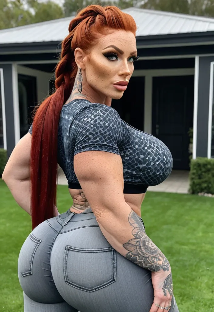 Generate Gorgeous female boss , bimbo , hourglass body , abnormally massive female bodybuilder , gorgeous , close up , full lips , big booty , redheaded , freckles on face and breast , braided design hair , feminine silhouette , too big breast , big booty , sexy thighs abs , silhouette , up close , flexing biceps , beautiful green eyes , legs are iconic and defining physical feature , both visually and in terms of combat ability.wearing an outfit that is a striking blend of elegance , power , and femininity , designed to command attention in any room. The suit is tailored to perfection , hugging the wearer’s curves with precision while emphasizing a structured silhouette. The fabric itself is a refined grey tweed patterned with subtle white grid lines , giving the suit a texture that feels both sophisticated and modern. The blazer features broad blue lapels and gold button accents , adding a luxurious touch that elevates the look beyond typical business attire. The matching high-waisted trousers elongate the frame , further enhancing the poised and commanding effect of the ensemble.The styling choices amplify the boldness of the suit. The inner blouse is a silky , greybutton-down shirt that complements the tweed’s tone while introducing a softer , feminine balance to the sharp tailoring of the jacket. The blouse peeks out neatly from under the blazer , maintaining elegance without drawing focus away from the suit’s commanding cut. Accessories are kept minimal yet intentional: a delicate layered gold necklace and hoop earrings that add glimmers of light and luxury without overpowering the outfit. The choice of voluminous , honey-brown braids cascading down her shoulders frames the face with both confidence and glamour , completing the commanding visual.Altogether , this look communicates a blend of authority and allure. It is business-ready yet fashion-forward , balancing corporate structure with vibrant femininity. The color palette blue , grey and gold avoids being overly delicate , instead embracing the richness of texture , structure , and presence. This is the kind of ensemble that speaks to ambition , sophistication , and personal style—ideal for someone who thrives in positions of influence but insists on expressing her individuality with bold elegance. It’s not just clothing—it’s a statement of power wrapped in grace. In luxury living legs that could crush a watermelon , skirt high boots are a bold and striking statement piece , crafted in glossy black patent leather that gives them a sleek , polished finish. Rising to just below the knee , the boots feature three adjustable buckle straps along the shaft , adding both edge and detail to their design. The towering stiletto heel , paired with a thick platform sole , creates an ultra-dramatic silhouette that elongates the leg and exudes power and confidence. With their combination of shine , height , and structure , these boots perfectly balance fierce femininity with high-fashion allure. Massive breast , massive cleavage , standiing backyard , wearing a black , blue amd gray square patterned t-shirt , gray denim pants , enormous butt , freckles , big gorgeous green eyes , ,