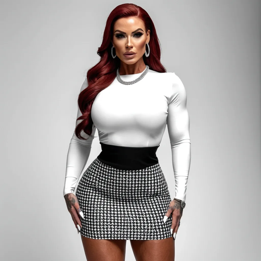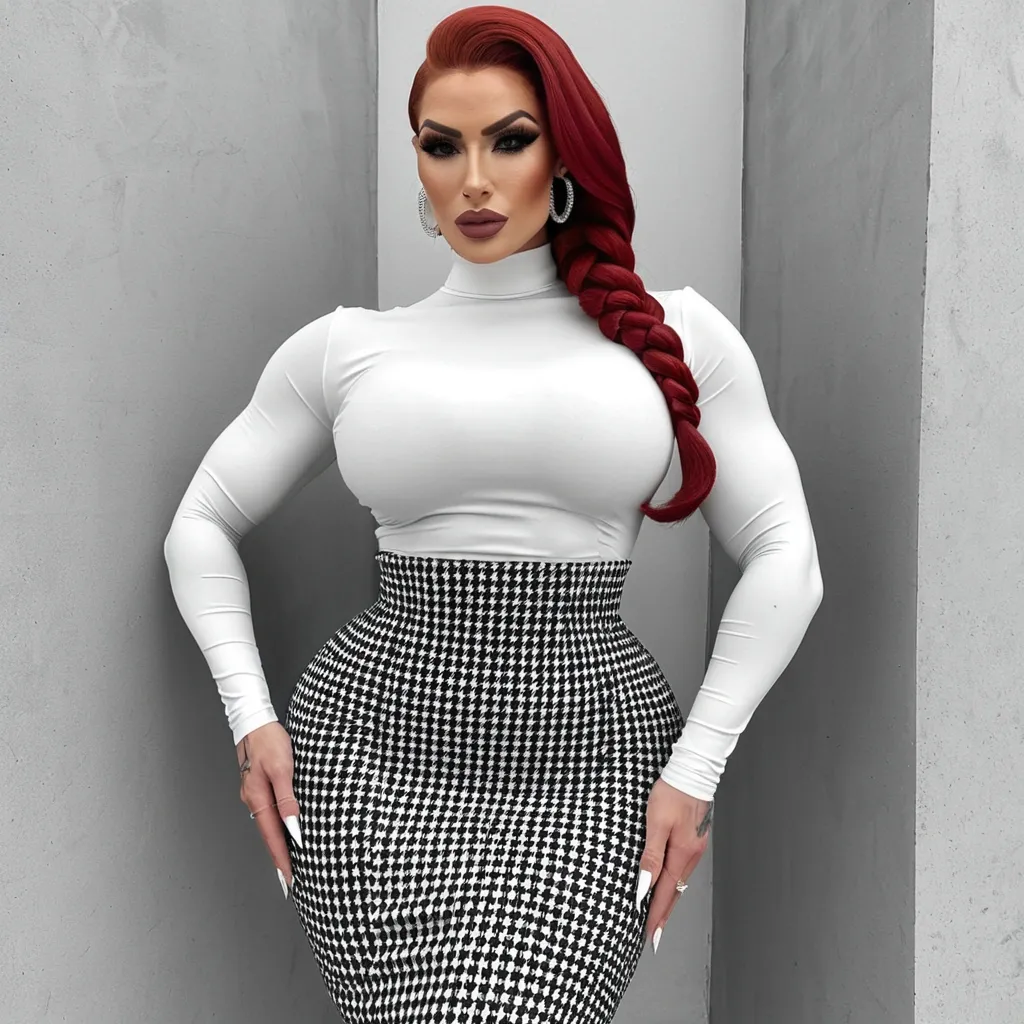 Generate Gorgeous female boss , bimbo , hourglass body , abnormally massive female bodybuilder , gorgeous , close up , full lips , big booty , redheaded , freckles on face and breast , braided design hair , feminine silhouette , too big breast , big booty , sexy thighs abs , silhouette , up close , flexing biceps , beautiful green eyes , legs are iconic and defining physical feature , both visually and in terms of combat ability.wearing an outfit that is a striking blend of elegance , power , and femininity , designed to command attention in any room. The suit is tailored to perfection , hugging the wearer’s curves with precision while emphasizing a structured silhouette. The fabric itself is a refined grey tweed patterned with subtle white grid lines , giving the suit a texture that feels both sophisticated and modern. The blazer features broad blue lapels and gold button accents , adding a luxurious touch that elevates the look beyond typical business attire. The matching high-waisted trousers elongate the frame , further enhancing the poised and commanding effect of the ensemble.The styling choices amplify the boldness of the suit. The inner blouse is a silky , greybutton-down shirt that complements the tweed’s tone while introducing a softer , feminine balance to the sharp tailoring of the jacket. The blouse peeks out neatly from under the blazer , maintaining elegance without drawing focus away from the suit’s commanding cut. Accessories are kept minimal yet intentional: a delicate layered gold necklace and hoop earrings that add glimmers of light and luxury without overpowering the outfit. The choice of voluminous , honey-brown braids cascading down her shoulders frames the face with both confidence and glamour , completing the commanding visual.Altogether , this look communicates a blend of authority and allure. It is business-ready yet fashion-forward , balancing corporate structure with vibrant femininity. The color palette blue , grey and gold avoids being overly delicate , instead embracing the richness of texture , structure , and presence. This is the kind of ensemble that speaks to ambition , sophistication , and personal style—ideal for someone who thrives in positions of influence but insists on expressing her individuality with bold elegance. It’s not just clothing—it’s a statement of power wrapped in grace. In luxury living legs that could crush a watermelon , skirt high boots are a bold and striking statement piece , crafted in glossy black patent leather that gives them a sleek , polished finish. Rising to just below the knee , the boots feature three adjustable buckle straps along the shaft , adding both edge and detail to their design. The towering stiletto heel , paired with a thick platform sole , creates an ultra-dramatic silhouette that elongates the leg and exudes power and confidence. With their combination of shine , height , and structure , these boots perfectly balance fierce femininity with high-fashion allure. The outfit is a striking blend of simplicity and bold patterning , built around two main elements: the fitted white long-sleeve top and the high-waisted houndstooth skirt. The white top is smooth , clean , and body-hugging , emphasizing shape while keeping a minimalist elegance. Its long sleeves and rounded neckline create a polished , almost timeless look that allows the bottom half of the outfit to make the louder statement.The skirt contrasts sharply with the top through its black-and-white houndstooth pattern—a classic design that immediately draws the eye. High-waisted in cut , it cinches the figure neatly , accentuating curves and creating an hourglass silhouette. The pattern’s boldness gives the ensemble a sense of sophistication and modernity , balancing the plainness of the white top while keeping the whole look chic rather than overwhelming.Together , the two pieces create a balanced composition: the top projects refined simplicity while the skirt injects bold style. The overall effect is one of confidence and poise—an outfit that feels equally suited for a professional environment , a fashionable social gathering , or a statement appearance where elegance with an edge is the goal. It’s a look that plays with contrast and balance , delivering both subtlety and drama in one. Wide hips , silver necklace ,