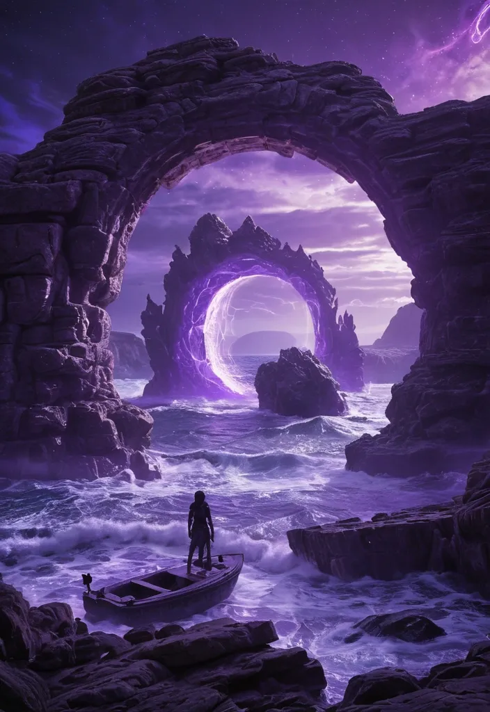 A huge weathered circular stone portal embedded in a rock wall , glowing with swirling purple energy stands in an alien ocean landscape , scattered deadly waves , and distant rock formations. A single person with boat in the foreground , highlighting the immense scale , ancient construction , and quiet , mysterious atmosphere. ,