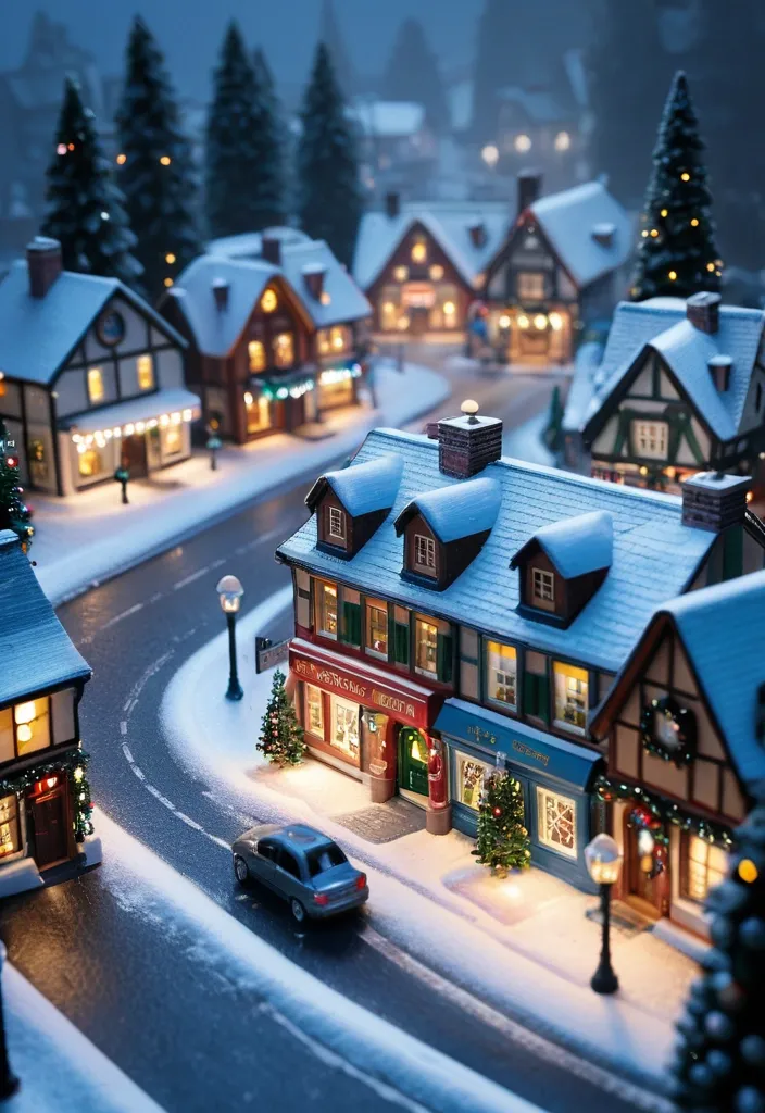 A photorealistic ESC keycap scene shows a miniature cozy snow-covered street setup. Inside: charming village aglow with the warmth of Christmas cheer. Quaint houses , adorned with multicolored , twinkling lights and festive evergreen wreaths , line the road , their windows shimmering invitingly. Outside: cool tech-blue reflections on F1 , Shift , and Q keys. The word “ESC” is subtly present in a glassy fog on top of the cap. ,