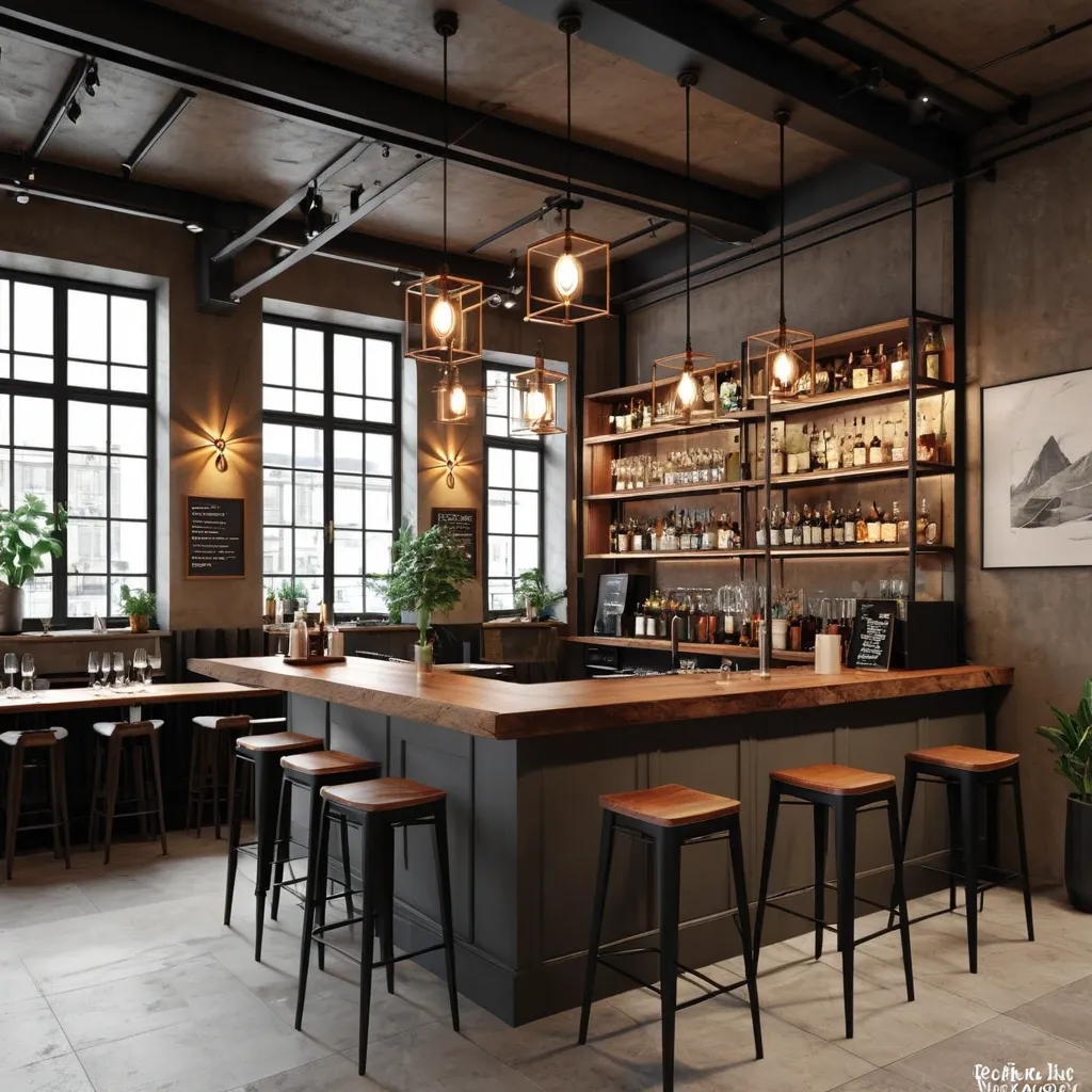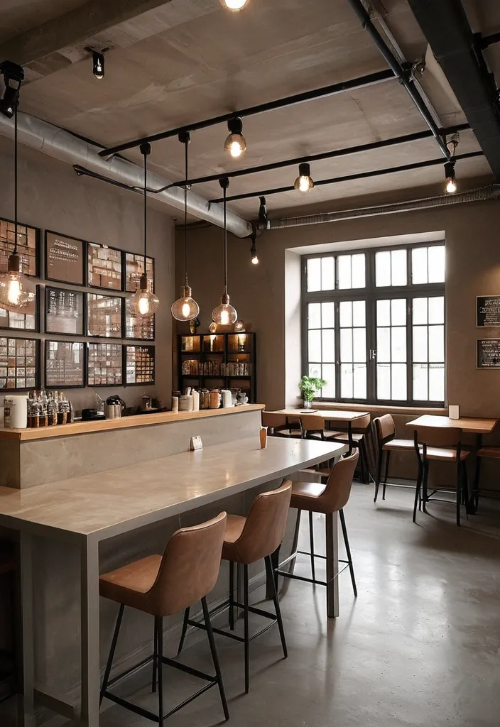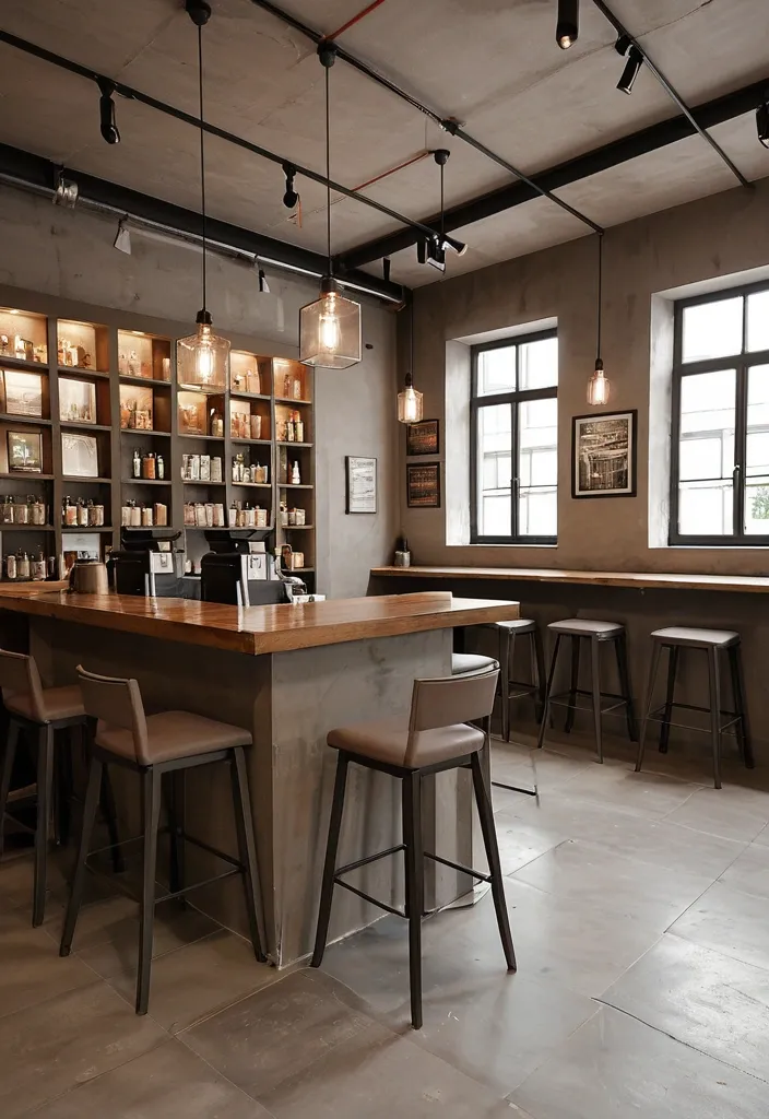 Create a realistic interior design of a 60-square-meter café in a modern loft style. • On the top wall , place the bar counter , reception , and cash register area. • On the right side , add large stained-glass windows and doors that let in plenty of natural light. • The floor should be concrete , but make it look stylish and refined (for example , polished or with a decorative finish). • Walls are painted in a taupe color , with some lighter accents to avoid a dark or dull look. • Add square tables and wooden chairs. • Above each table , hang pendant lamps for a cozy atmosphere. • Decorate the walls with framed photos in a loft style , related to coffee or café culture. • Include wooden bookshelves with plants , books , small statues , and decorative items for warmth and personality. • Make sure the space feels cozy and welcoming , not dark or monotonous — use contrasting light and warm tones. • Add lighting fixtures above the bar area as well. • Behind the bar , include a sign with the café name and a menu board on the wall. ,