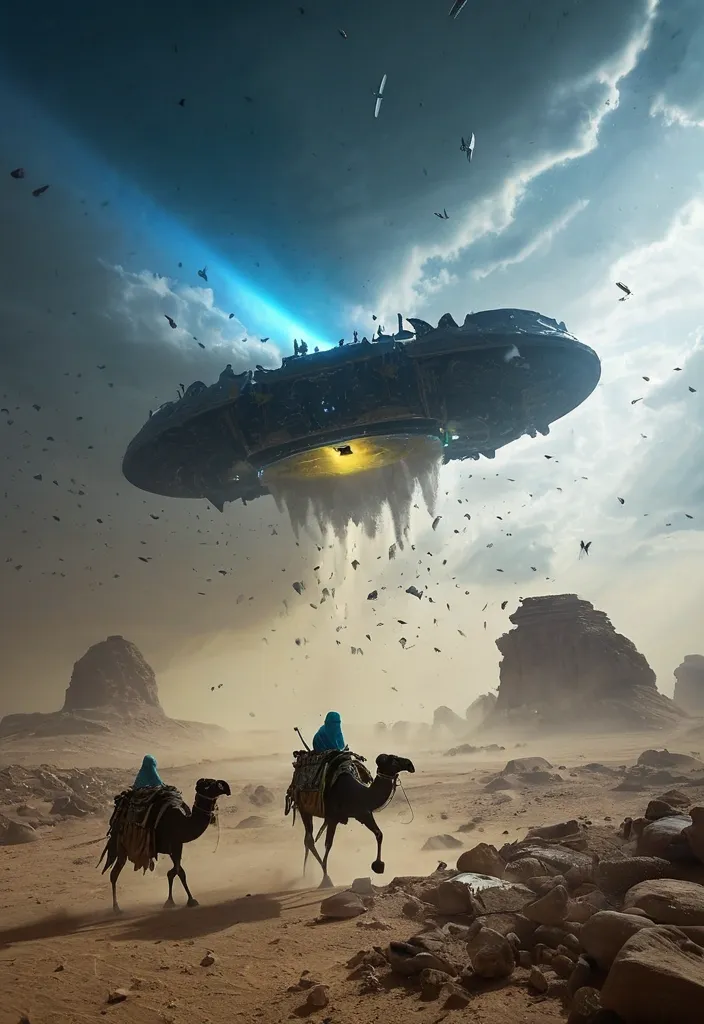Debris—stones , dust , and fragments—rise from the ground , suspended within the turbulence. Arabian black desert and in front a silhouette of Ancient migrate with their camels and belongings , and in front of them is a caravan leader enter in Wings , appears to dissolve into a shifting , storm-like formation made of blues , greens , yellows , and muted reds. Emerging from this mist is a single giant spacecraft , its vivid blend of blue and yellow and centered. The propeller are rendered with striking detail , tapering outward as though the spacecraft belongs to something alive hidden within the vapor. To the left of the iris , a Wings is partially embedded in the clouded sky , revealing a bright blue sky with white clouds beyond it. The sky sits at eye level , almost aligned with the gaze itself , giving the impression that the spacecraft is looking outward—or inward—through the opening. The surrounding clouds billow up to the ceiling. ,