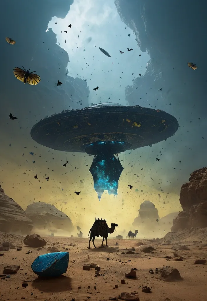 Debris—stones , dust , and fragments—rise from the ground , suspended within the turbulence. Arabian black desert and in front a silhouette of Ancient migrate with their camels and belongings , and in front of them is a caravan leader enter in Butterfly wings , appears to dissolve into a shifting , storm-like formation made of blues , greens , yellows , and muted reds. Emerging from this mist is a single giant spacecraft , its vivid blend of blue and yellow and centered. The propeller are rendered with striking detail , tapering outward as though the spacecraft belongs to something alive hidden within the vapor. The surrounding clouds billow up to the ceiling. ,