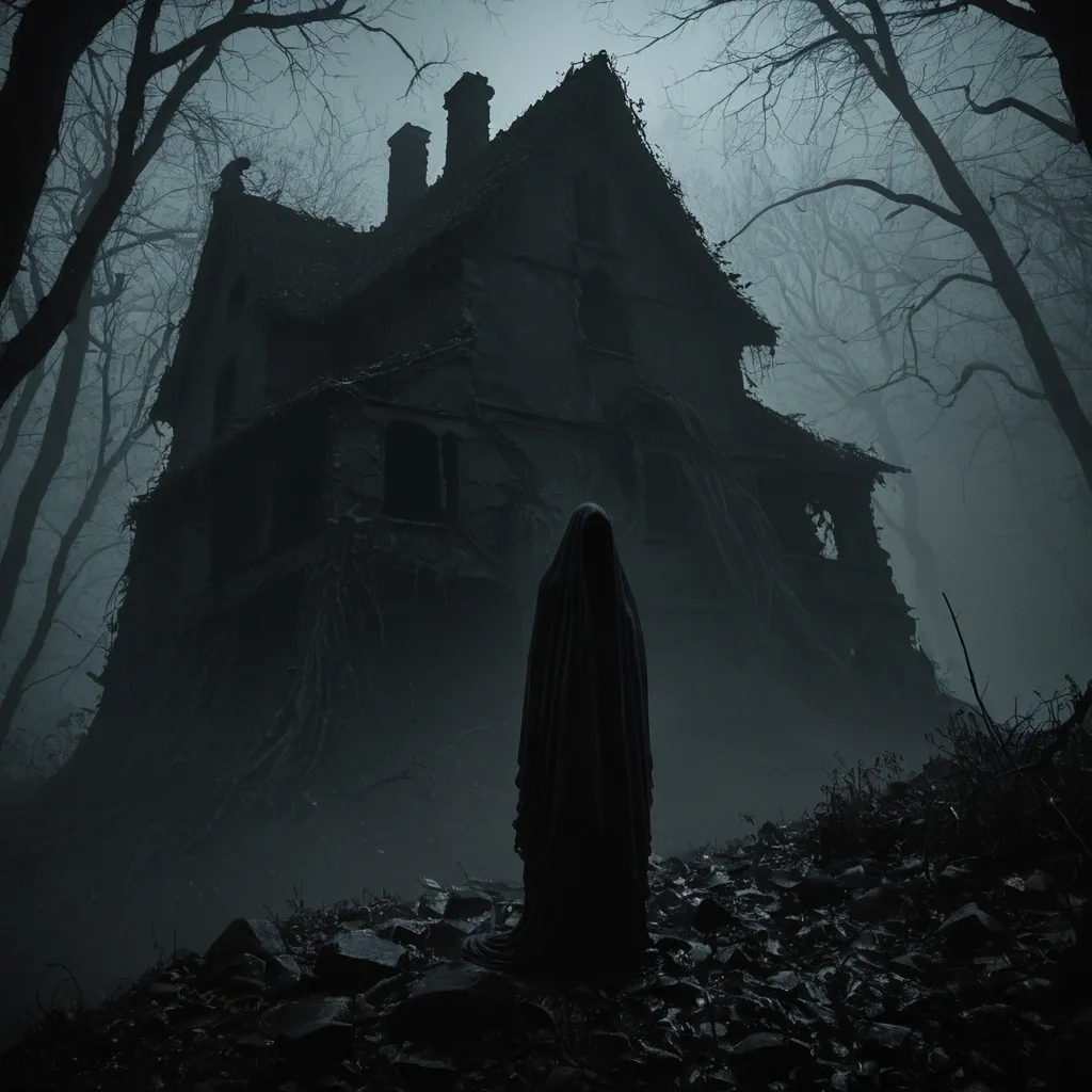 at the foreground , a silhouetted ghost figure fly atop a rugged outcropping of rock , shrouded in darkness. its body , distorted and elongated , like a twisted reflection in a fun-house mirror , appears to be shrouded in a tangle of wispy shadows. as the mist wraps around it , the ghost's form begins to blur and fade , merging with the ether like a whispered secret. as the mist envelops the figure , its dark form blends seamlessly with the surrounding environment , becoming one with the shadows. the air is heavy with the scent of damp earth and decaying leaves , evoking a melancholic sense of mortality. amidst this haunting tableau , an eerie aura reigns , as if the very fabric of life and death hangs precariously in the balance. a sense of existential angst pervades the atmosphere , as if the impermanence of the human form hangs in the balance. the image exudes a soft , dark aesthetic , imbued with a profound sense of mysticism and reverence for the ephemeral nature of existence. the colors , muted and earthy , seem to seep from the shadows themselves , imbuing the scene with an air of somber contemplation. ,