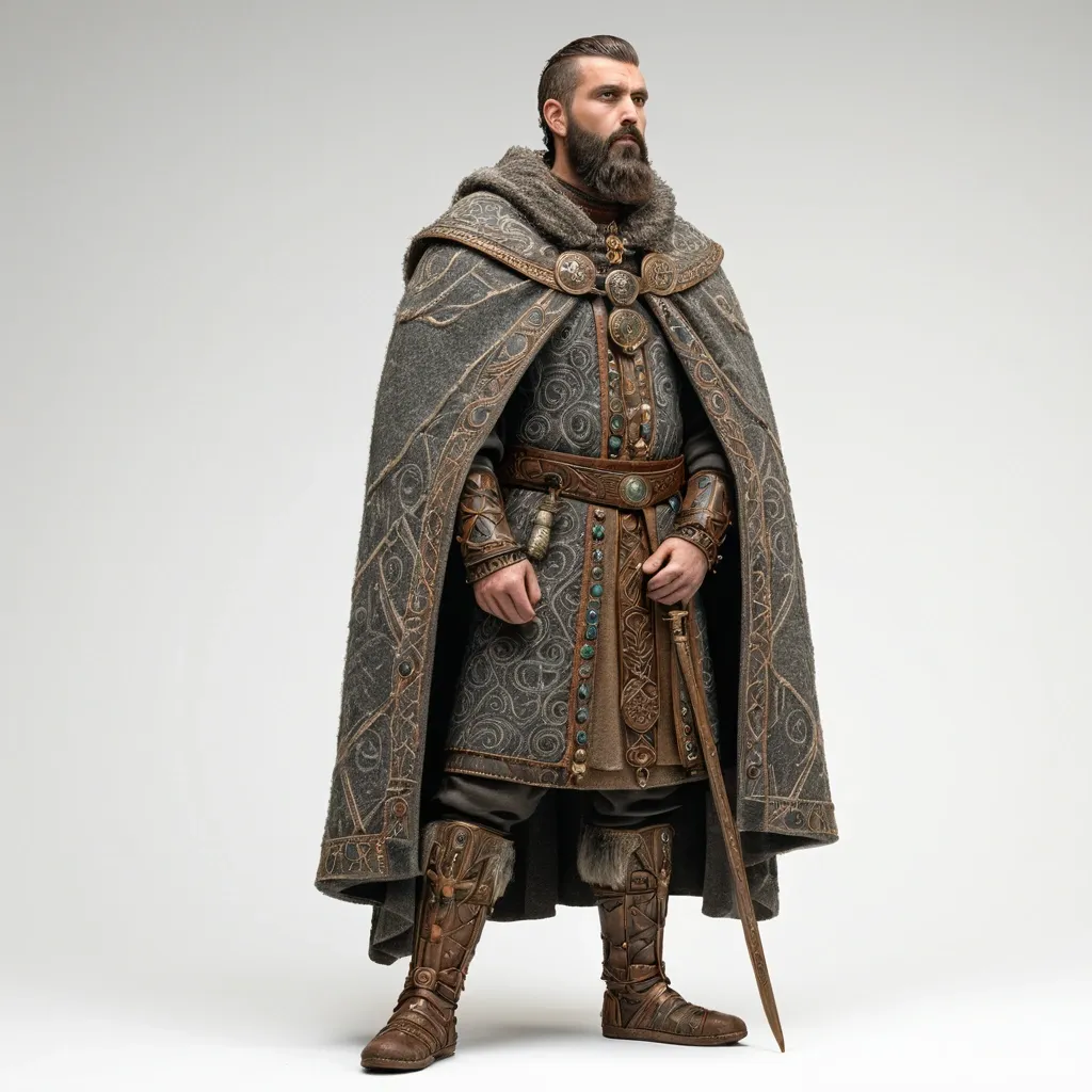 King Bridei , Pictish ruler in ornate woolen cloak with bronze brooch and carved torque , short beard and commanding gaze , Style: hyperrealistic with a painterly texture , reminiscent of historical reconstruction art , detailed and atmospheric , Full body , Leather boots , Side View , 4K , White or Transparent Background. ,