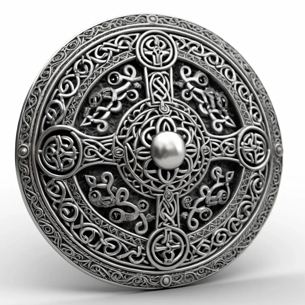 Silver Jewelry 8th C Pictish , ornate brooches and chains with intricate knotwork and animal motifs , finely crafted from polished silver , Style: hyperrealistic with a painterly texture , reminiscent of historical reconstruction art , detailed and atmospheric with subtle depth of field , White or Transparent Background , Full view , Side View , 4K. ,