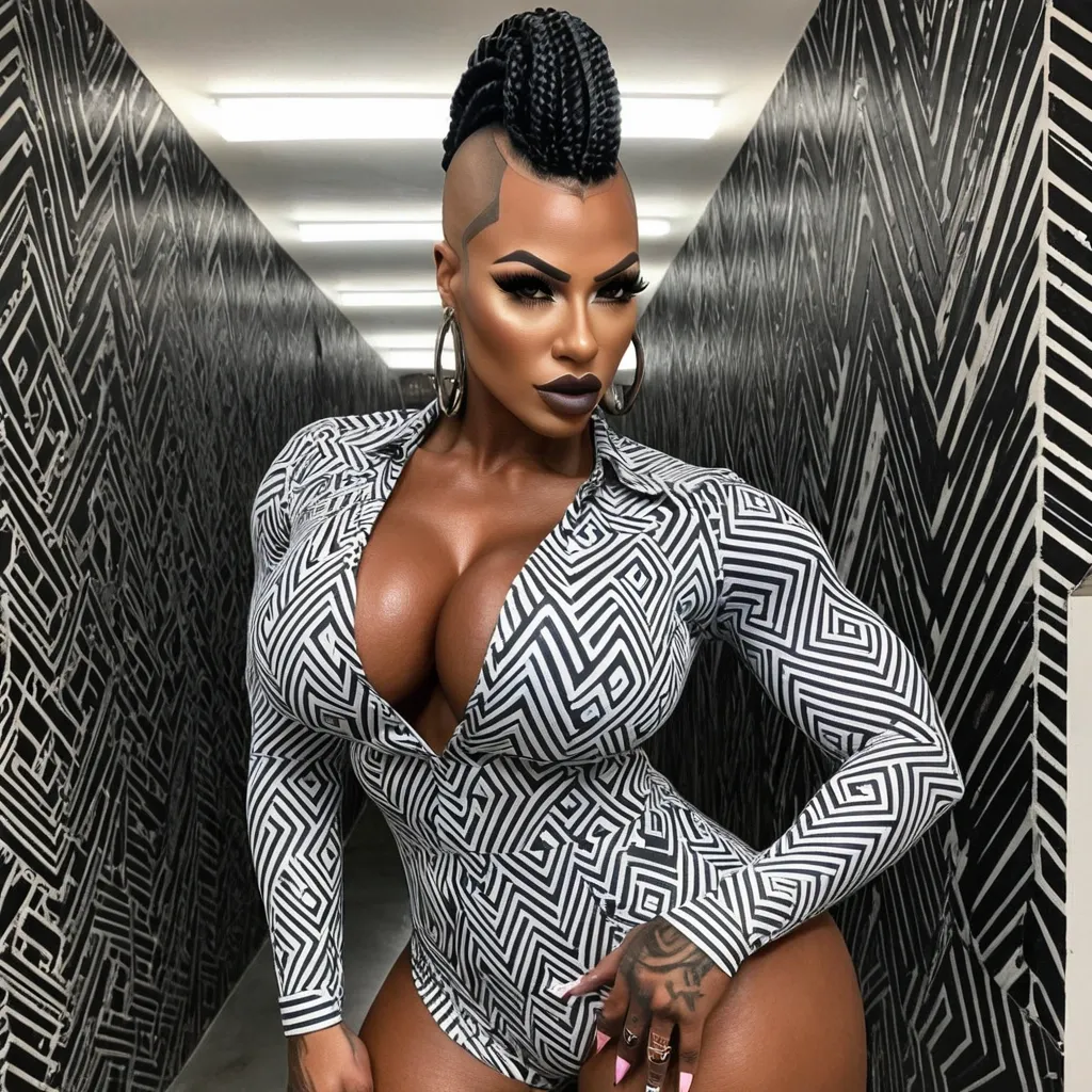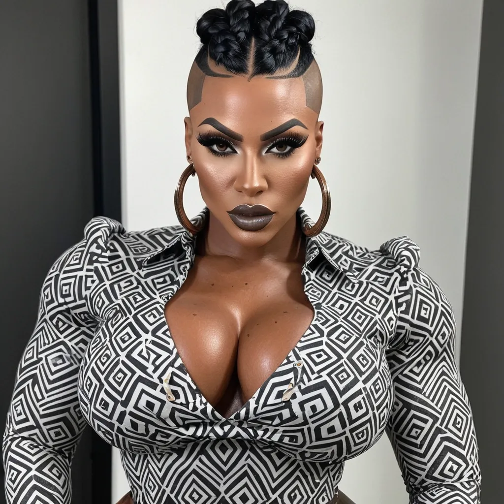 Generate Gorgeous female boss , bimbo , 24 years old , very dark-skinned African-American woman , , gorgeous hazel eyes , hourglass body , abnormally massive female bodybuilder , gorgeous , close up , full lips , big booty , braided mohawk styled mohawk , bald on the side , feminine silhouette , too big breast , big booty , sexy thighs abs , silhouette , up close , flexing biceps , beautiful hazel eyes , legs are iconic and defining physical feature , both visually and in terms of combat ability.wearing an outfit that is a striking blend of elegance , power , and femininity , designed to command attention in any room. The suit is tailored to perfection , hugging the wearer’s curves with precision while emphasizing a structured silhouette. The fabric itself is a refined grey tweed patterned with subtle white grid lines , giving the suit a texture that feels both sophisticated and modern. The blazer features broad blue lapels and gold button accents , adding a luxurious touch that elevates the look beyond typical business attire. The matching high-waisted trousers elongate the frame , further enhancing the poised and commanding effect of the ensemble.The styling choices amplify the boldness of the suit. The inner blouse is a silky , greybutton-down shirt that complements the tweed’s tone while introducing a softer , feminine balance to the sharp tailoring of the jacket. The blouse peeks out neatly from under the blazer , maintaining elegance without drawing focus away from the suit’s commanding cut. Accessories are kept minimal yet intentional: a delicate layered gold necklace and hoop earrings that add glimmers of light and luxury without overpowering the outfit. The choice of voluminous , honey-brown braids cascading down her shoulders frames the face with both confidence and glamour , completing the commanding visual.Altogether , this look communicates a blend of authority and allure. It is business-ready yet fashion-forward , balancing corporate structure with vibrant femininity. The color palette blue , grey and gold avoids being overly delicate , instead embracing the richness of texture , structure , and presence. This is the kind of ensemble that speaks to ambition , sophistication , and personal style—ideal for someone who thrives in positions of influence but insists on expressing her individuality with bold elegance. It’s not just clothing—it’s a statement of power wrapped in grace. In luxury living legs that could crush a watermelon , skirt high boots are a bold and striking statement piece , crafted in glossy black patent leather that gives them a sleek , polished finish. Rising to just below the knee , the boots feature three adjustable buckle straps along the shaft , adding both edge and detail to their design. The towering stiletto heel , paired with a thick platform sole , creates an ultra-dramatic silhouette that elongates the leg and exudes power and confidence. With their combination of shine , height , and structure , these boots perfectly balance fierce femininity with high-fashion allure. High cheekbones , prominent jawline , gorgeous big brown eyes , freckles , enormous breast , bluish gray and black chevrons designed dress work shirt , cheetah print top and denim shorts , ,