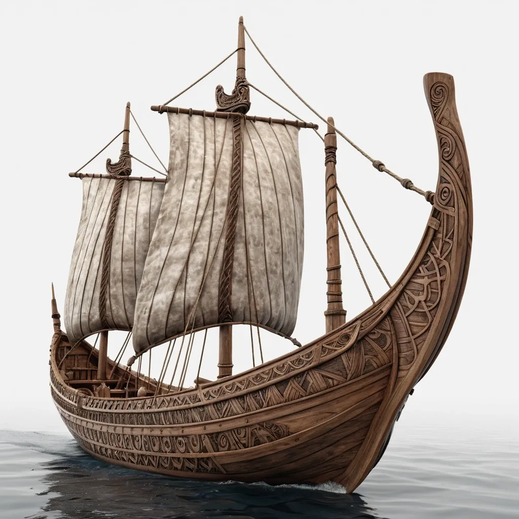 Large Pictish Ship , wooden vessel with curved hull , high prow and stern , decorated with carved knotwork and carrying hide sails , Style: hyperrealistic with a painterly texture , reminiscent of historical reconstruction art , detailed and atmospheric with subtle depth of field , White or Transparent Background , Full view , Side View , 4K. ,