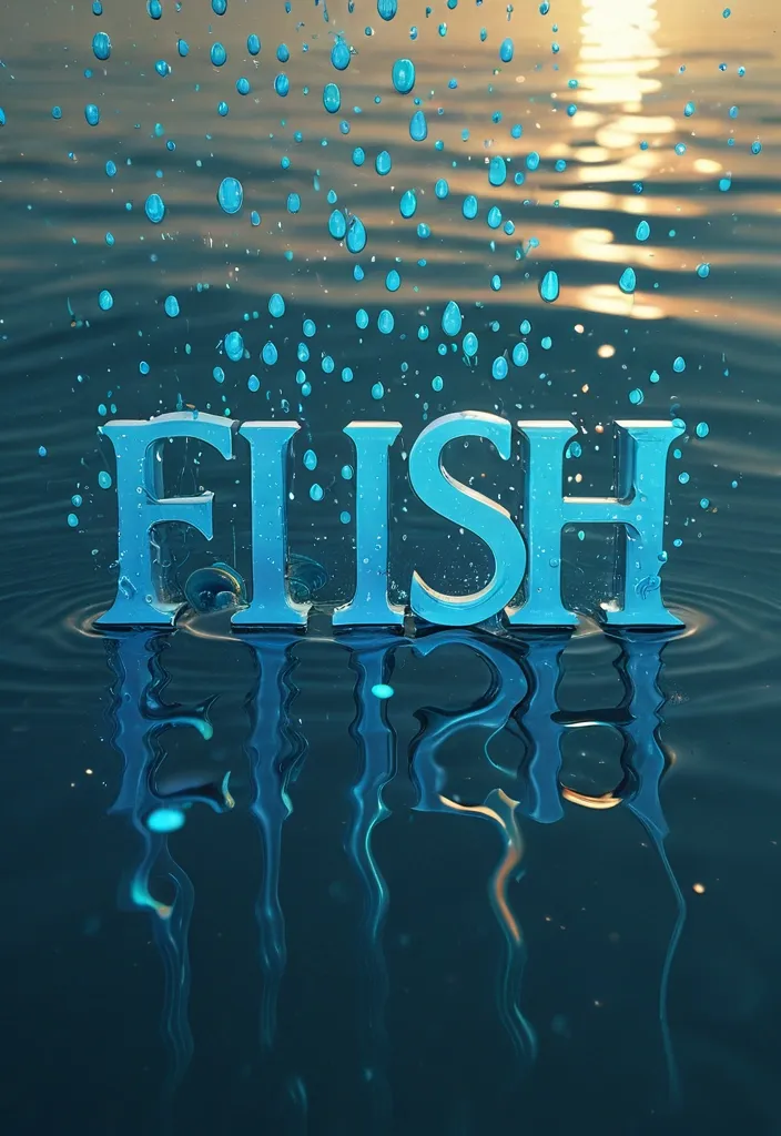 Minimalist , surreal , organic 3D cinematic text "Fish" , with Liquid Metal enhancements , sunset is reflected inside the Liquid droplets , set against a underwater background. The fluoride is not dull blue but alive with swirling color group of fish: liquid arcs of cyan , golden ripple and refract across text. Sparkling water splash and drops , streaking blue light trails , sense of movement and wonder , magical atmosphere Quality: High detail , 4K , Masterpiece , Rendered in Octane. ,
