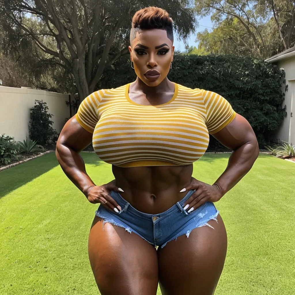 Generate Gorgeous female boss , bimbo , very dark-skinned African-American female , hourglass body , abnormally massive female bodybuilder , gorgeous , close up , full lips , big booty , brown , on face and breast , short pixie hair , big lipsfeminine silhouette , too big breast , big booty , sexy thighs abs , silhouette , up close , flexing biceps , beautiful green eyes , legs are iconic and defining physical feature , both visually and in terms of combat ability.wearing an outfit that is a striking blend of elegance , power , and femininity , designed to command attention in any room. The suit is tailored to perfection , hugging the wearer’s curves with precision while emphasizing a structured silhouette. The fabric itself is a refined grey tweed patterned with subtle white grid lines , giving the suit a texture that feels both sophisticated and modern. The blazer features broad blue lapels and gold button accents , adding a luxurious touch that elevates the look beyond typical business attire. The matching high-waisted trousers elongate the frame , further enhancing the poised and commanding effect of the ensemble.The styling choices amplify the boldness of the suit. The inner blouse is a silky , greybutton-down shirt that complements the tweed’s tone while introducing a softer , feminine balance to the sharp tailoring of the jacket. The blouse peeks out neatly from under the blazer , maintaining elegance without drawing focus away from the suit’s commanding cut. Accessories are kept minimal yet intentional: a delicate layered gold necklace and hoop earrings that add glimmers of light and luxury without overpowering the outfit. The choice of voluminous , honey-brown braids cascading down her shoulders frames the face with both confidence and glamour , completing the commanding visual.Altogether , this look communicates a blend of authority and allure. It is business-ready yet fashion-forward , balancing corporate structure with vibrant femininity. The color palette blue , grey and gold avoids being overly delicate , instead embracing the richness of texture , structure , and presence. This is the kind of ensemble that speaks to ambition , sophistication , and personal style—ideal for someone who thrives in positions of influence but insists on expressing her individuality with bold elegance. It’s not just clothing—it’s a statement of power wrapped in grace. In luxury living legs that could crush a watermelon , skirt high boots are a bold and striking statement piece , crafted in glossy black patent leather that gives them a sleek , polished finish. Rising to just below the knee , the boots feature three adjustable buckle straps along the shaft , adding both edge and detail to their design. The towering stiletto heel , paired with a thick platform sole , creates an ultra-dramatic silhouette that elongates the leg and exudes power and confidence. With their combination of shine , height , and structure , these boots perfectly balance fierce femininity with high-fashion allure. High cheekbones , prominent jawline , gorgeous big light reflecting hazel eyes , enormous breast , blue and yellow horizontal striped t-shirt , denim shorts , denim walking in backyard , enormous butt , enormous breast , thunder thighs and hips ,