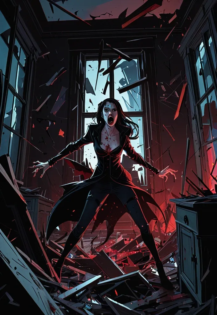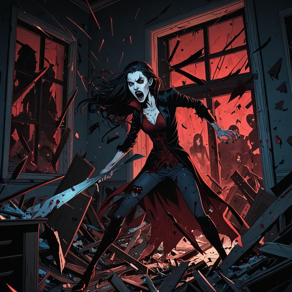 A swarm of vampires violently invades her home , shattering windows and tearing down doors. This illustration is rendered in a graphic novel style , with bold lines and dramatic shadows , reminiscent of Artstation illustrations. Inside , furniture is overturned , and the air is thick with tension. The vampires , with their menacing eyes and sharp fangs , are relentless in their attack. The overall color palette is dark and chaotic , with deep reds , blues , and blacks dominating , emphasizing the violence and terror of the invasion. Shattered glass and splintered wood litter the scene , adding to the sense of destruction. The slender , graceful vampire is in the middle of the chaos , fighting back with determination. ,