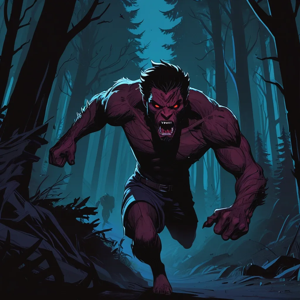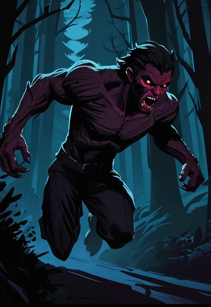 Upon discovering she is being hunted by vampires , a strong , imposing werewolf races to her rescue. This illustration is rendered in a graphic novel style , with bold lines and dramatic shadows , reminiscent of Artstation illustrations. He is running at full speed through a dark forest , his expression determined and fierce. The trees blur past him as he pushes himself to his limits. The overall color palette is dark and urgent , with deep blues , purples , and reds dominating , emphasizing the urgency and danger of his mission. ,
