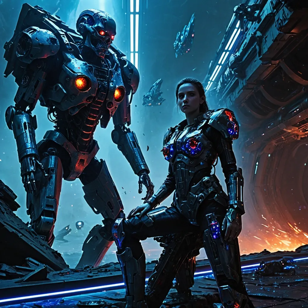 Creates a realistic Terminator-style portrait. Upload your photo and paste the prompt below. A more cinematic version , while Seedream is closer to realism and more accurately draws a portrait from a photo. Create a photo-realistic color portrait in a 4:3 vertical aspect ratio. I am wearing a military dress. The left side of my body remains human , while the right side (face + neck + upper torso under the shirt) is visible as a metallic cybernetic endoskeleton with mechanical parts and a glowing red robotic eye. The transition between skin and metal should appear realistic , with natural-looking scorched edges , slightly cracked fabric , subtle dried blood , and signs of battle damage (not a straight cut line). In backdrop a flowing , Giant Hulk , snarling under a sprawling , star-filled night sky , Glowing eyes , muscular , silhouette emerges from a mass of swirling. The Hulk is composed entirely of soft , fluid streaks that blend into one another: luminous white and pale gray at the head and shoulders , shifting into bright cyan. The head tilts gently downward , defined only by subtle curves and shadows formed by the color transitions. Cinematic dramatic lighting , dark , moody background , hyper-realistic sci-fi aesthetics of film quality , natural skin pores , no cartoons or illustrations , crisp 4K resolution. ,