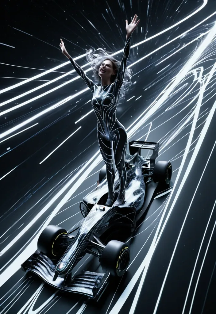 Bird's eye view , a clouds depicted in an Abstract graphic Interference style , with swirling lines patterns and dynamic light motion speed effects. The holographic elements should create a sense of movement and energy with a beautiful woman stands triumphantly on the roof of his F1-race car as it slowly crosses the checkered finish line. His arms are raised victoriously , and a smile. a slender figure. . Employ a black color palette of sapphire black with iridescent shimmer. Style: Celestial , ethereal , abstract , digital art black Lighting: Dramatic backlighting , bright glowing particles , contrasting dark background Composition: dynamic diagonal , composition , upward gaze Details: Sparkling gray waves and smoke , streaking white light trails , sense of movement and wonder , magical atmosphere Quality: High detail , 4K , Masterpiece , Rendered in Octane. Wide Angle View , Ultra Long Distance Wide Angle Lens ,