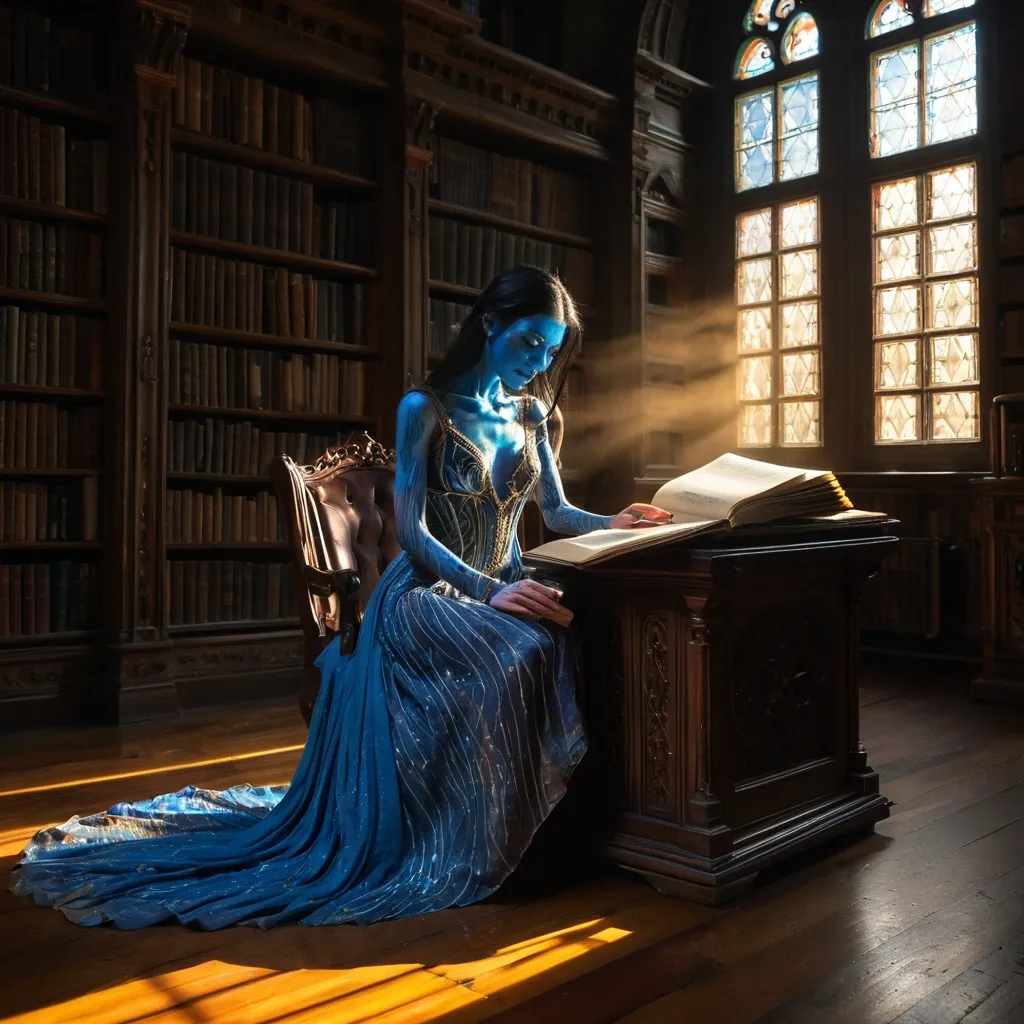 A slender woman with striking blue skin , adorned in an elegant , flowing gown that complements her unique hue , is seated gracefully in an ornate , well-worn leather chair nestled in a dimly lit Victorian library. The room is lined with towering bookshelves filled with ancient tomes , their spines cracked and faded. Soft golden light filters through a stained glass window , casting colorful patterns on the polished wooden floor. Dust motes dance in the air , illuminated by the warm glow. The woman’s long , dark hair cascades over her shoulders , and she gazes thoughtfully at an open book resting on her lap , her fingers delicately tracing the pages. A sense of timelessness envelops the scene , inviting viewers into this enchanting literary sanctuary. ,