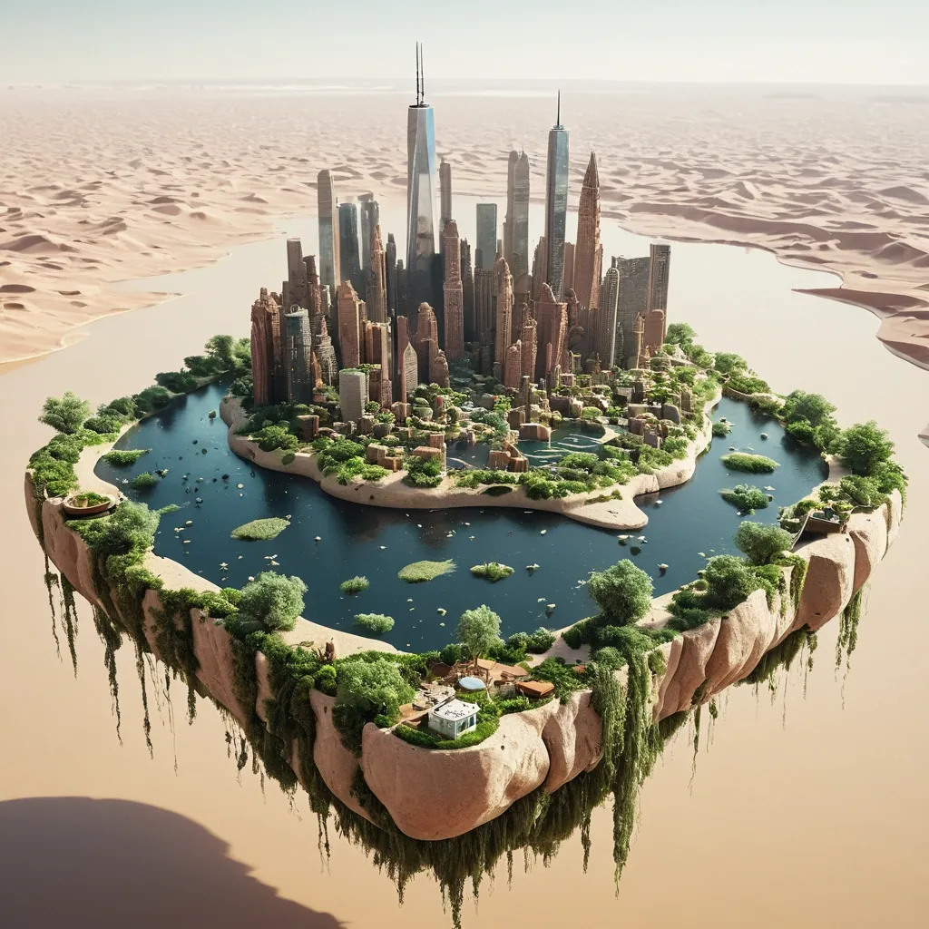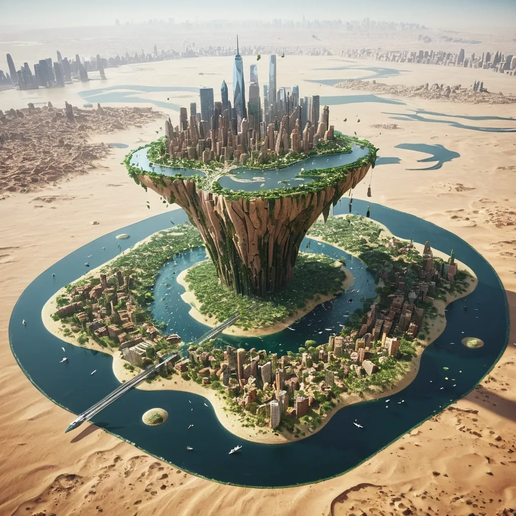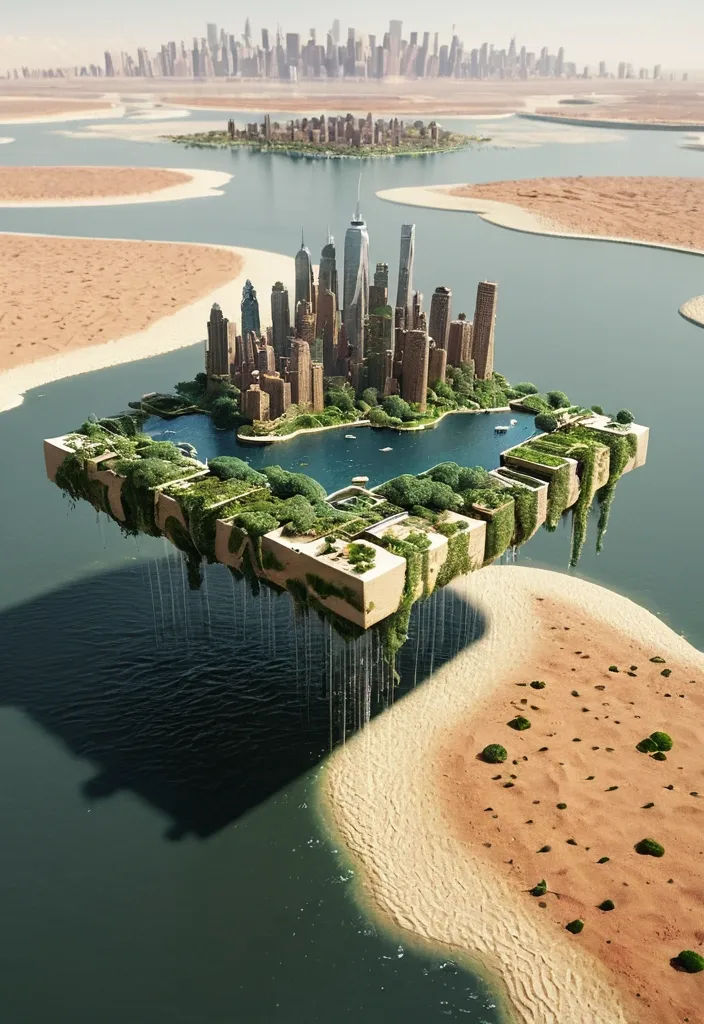 A floating island like Manhattan , with water and greenery flies over a dry and arid desert ,