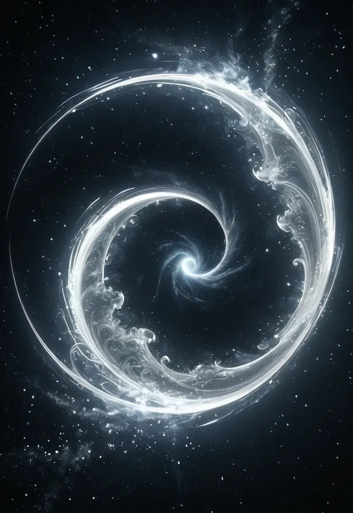 A stunning visual of a swirling moon split perfectly in half , suspended in the vast expanse of space. One side glows with a soft , silvery light , while the other side reveals a dark , mysterious interior filled with swirling cosmic dust and faint glimmers of starlight. Style: ethereal , abstract , digital art smoking: Dramatic backlighting , bright glowing particles , contrasting dark background Composition: dynamic diagonal composition , upward gaze Details: Sparkling white waves and smoke , streaking white light trails , sense of movement and wonder , magical atmosphere Quality: High detail , 4K , Masterpiece , Rendered in Octane , ,