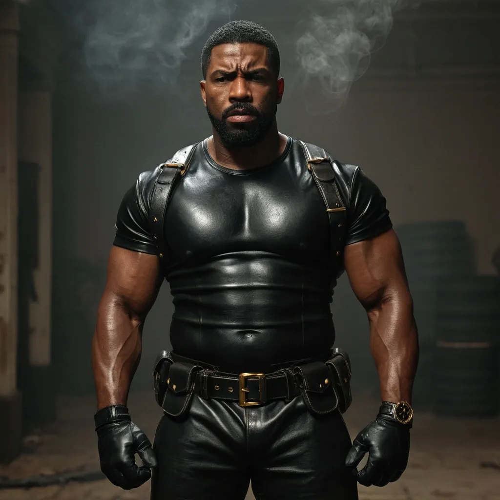 He’s a commanding African American man with a tight , clean low-cut hairstyle—precise , disciplined , no wasted motion. His face is broad and stern , carved with authority , dark eyes locked forward like they’re weighing a room before it even breathes. A thick , sharply groomed beard frames his jaw and chin , adding weight to an already intimidating presence. A cigar rests at the corner of his mouth , smoke curling upward like punctuation to his silence—this is a man who doesn’t rush words because he doesn’t need many. His body is massive and brutally athletic , the kind of build earned through years of iron , violence , or both. Thick shoulders , tree-trunk arms , and dense forearms veined and tight , all packed into a powerful , compact frame. Nothing about him is ornamental—every muscle looks functional , built for force and endurance. He stands with a grounded posture , fists clenched calmly at his waist , projecting the quiet confidence of someone who knows exactly what he can do and has done it before. He’s dressed in a fitted black leather short-sleeve shirt that stretches over his chest and arms , polished but battle-worn , paired with dark trousers and a heavy belt with a subtle metallic buckle. Leather shoulder holsters cross his torso , one holding a sidearm , the straps etched with understated detail—craftsmanship over flash. Black gloves and a gold watch finish the look , blending old-world grit with modern precision. The scene around him is dim and smoky , lit with moody , cinematic lighting that cuts across his features and leaves the background in shadow—like he’s standing at the center of a deal , a war , or a decision that won’t end well for someone else. ,