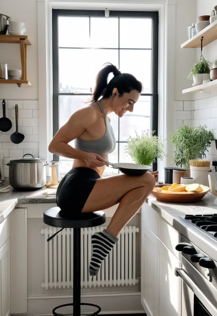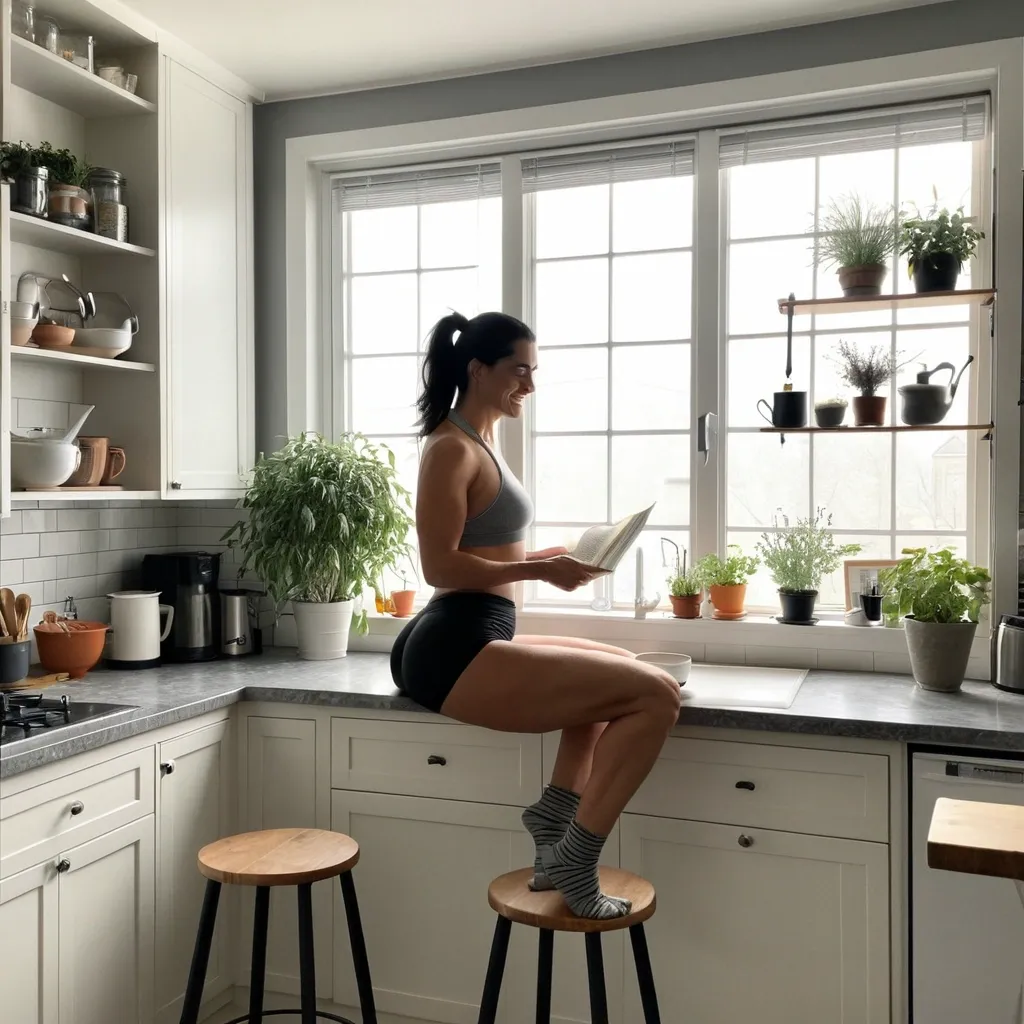 A young woman with slim gymnastics body , her dark hair in a ponytail as sits casually on a kitchen bar stool , illuminated by soft natural light streaming through a large window. She wears a heather gray halter top and black yoga shorts , her legs are crossed one over the other with her feet adorned in striped fuzzy socks dangling over the side. She sits at a kitchen countertop eating breakfast and reading a large book. Her gaze is directed at the viewer as she stirs a white bowl of cereal with a spoon , suggesting she's eating cereal sitting at the counter. She smiles warmly at the viewer. Above the window , several pots and colanders hang from hooks , and a shelf to the left holds small potted plants and various kitchen items. The scene conveys a relaxed , intimate atmosphere in what appears to be a cozy kitchen setting. ,