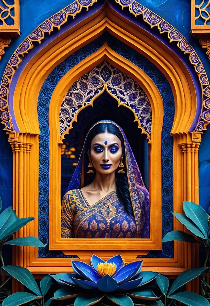 A young woman's face partially veiled by the intricate draping of a handwoven silk Saree (richly patterned with organic indigo-dyed motifs of peacocks and lotus vines) , her kohl-rimmed eyes reflecting golden flecks of afternoon light as she peers through an ancient teakwood window frame (carved with fractal-like kolam designs and miniature temple deities) , in a whimsical and vibrant scene blending surrealism and playful design. Use a rich , bright color palette of purples , oranges , blues , and yellows , emphasizing bold contrasts and harmonious tones. Incorporate fantastical elements such as celestial objects , dreamlike landscapes , oversized flora , and imaginative objects. Highlight smooth textures , clean lines , and intricate details , creating a balance between realism and surreal abstraction. Focus on an uplifting , magical atmosphere with dynamic compositions and a sense of wonder. ,