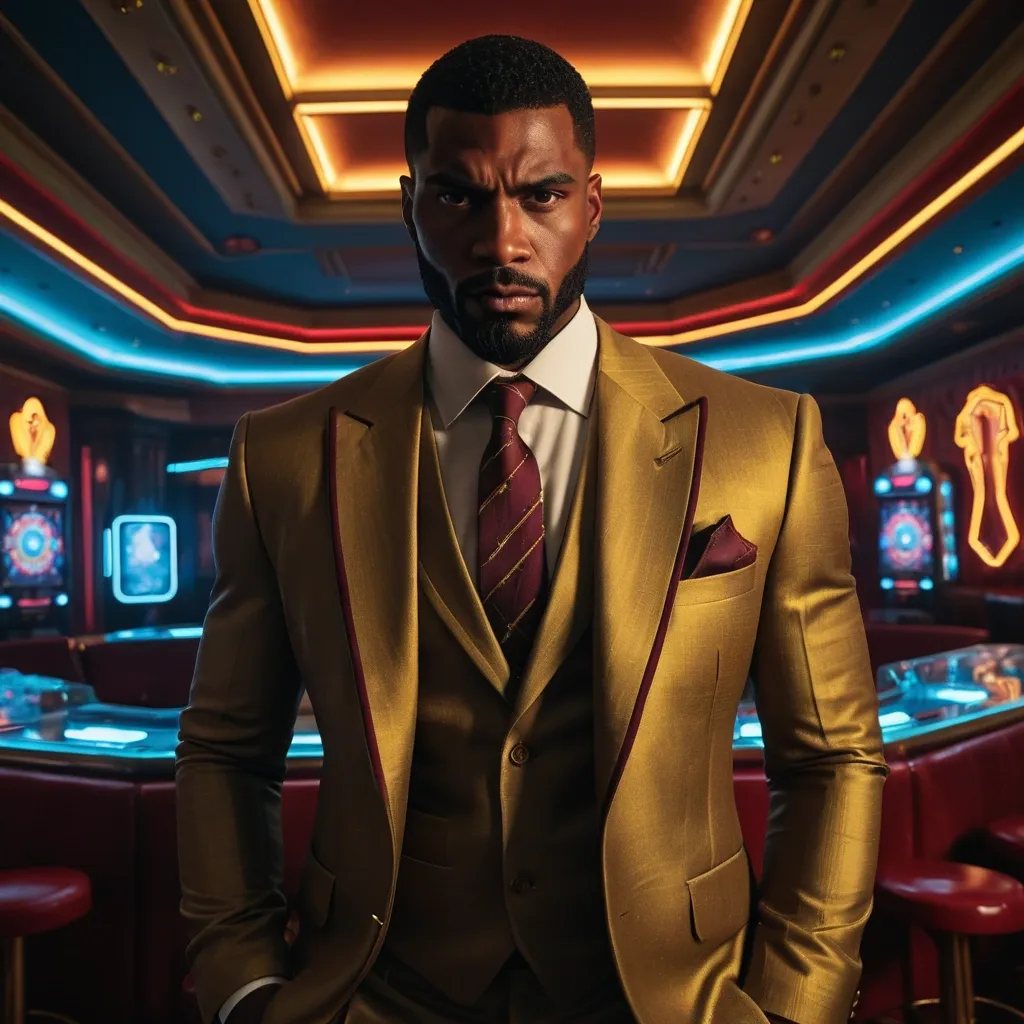 He is a Alpha Male , African-American man , He stands like a storm given a suit—tall , carved from power , and refined with purpose. His coarse , perfectly tapered hair crowns a face built from sharp geometry: high , sculpted cheekbones , a strong brow , and a jawline cut with the precision of a master craftsman. His gorgeous dark-brown eyes carry that quiet fire—focused , unblinking , the kind of gaze that tells a man’s whole story without offering a single hint. Full lips rest in a controlled , unreadable line , and the beard that frames them is immaculate , tight , and regal. His body looks engineered , not grown—broad , boulder shoulders pushing against the fabric of his tailored suit , arms thick and defined with every ridge of muscle visible even through the gold-toned weave. His chest and torso form a powerful taper into a narrow waist , emphasized by the deep olive vest and the sharp knot of his burgundy tie. Every stitch on him is intentional: the crisp lapels , the metallic trim tracing the angles of his physique , the pocket square folded with the kind of discipline that suggests he’s as dangerous as he is elegant. Behind him , Dream City glows in neon blues , reds , and molten gold—a retro-futuristic casino lounge where the dice never stop rolling and the air hums with electricity. The “21” neon cube burns above him like a crown of chance and danger , casting cinematic highlights across his suit and skin. He stands there in the middle of it all—debonair , imposing , and unbothered—looking like the man who owns the room , the night , and every secret hiding in its shadows. ,