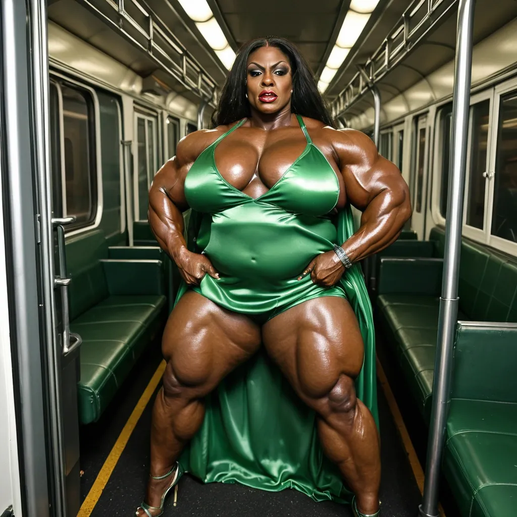 À african giant muscular chubby femalebodybuilder , housewife black woman BBW musclée , heavy weight bodybuildeuse géante et plantureuse with giant chest , imposante dame massive , beautiful make up Janet Jackson face , in a train , avec de gros seins , énormes biceps musclés , in green satin transparent short mini nightgown with heels , exposant les seins , bras musclés exposés , dominante , jambes massives exposées , agressive , ,