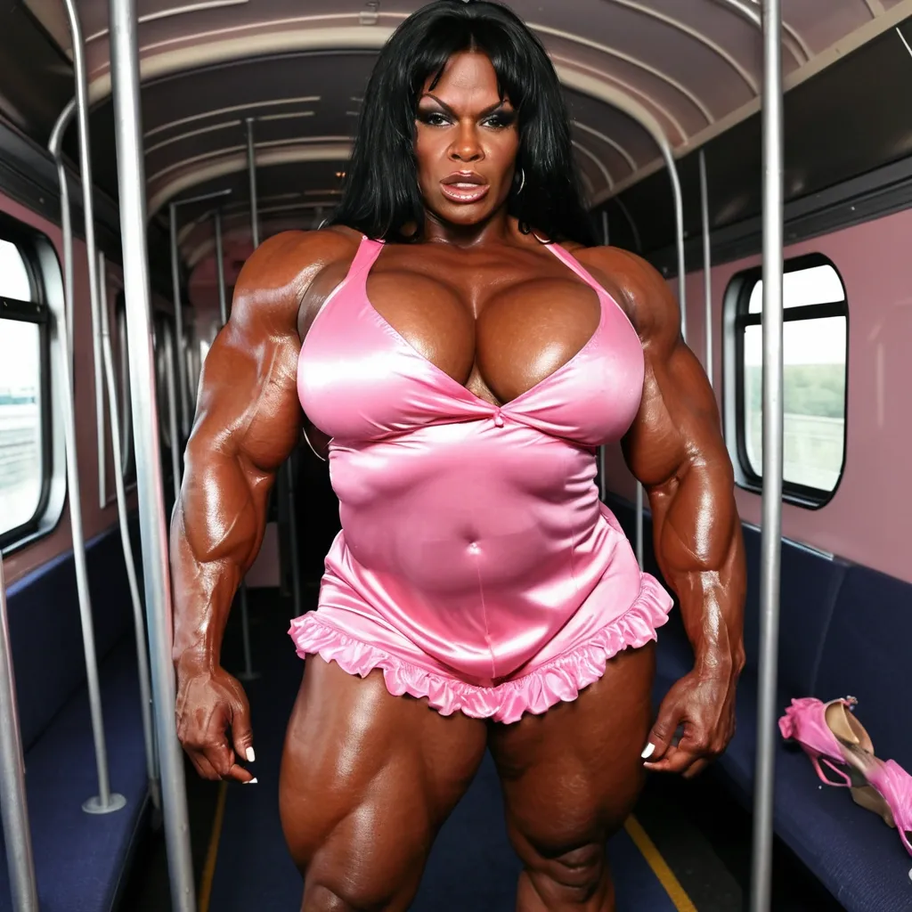 À african giant muscular chubby femalebodybuilder , housewife black woman BBW musclée , heavy weight bodybuildeuse géante et plantureuse with giant chest , imposante dame massive , beautiful make up pamela Anderson face , in a train , avec de gros seins , énormes biceps musclés , in pink satin transparent short mini nightgown with heels , exposant les seins , bras musclés exposés , dominante , jambes massives exposées , agressive , ,