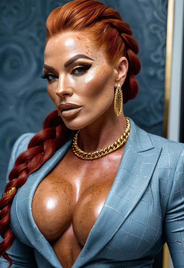 Generate Gorgeous female boss , bimbo , hourglass body , abnormally massive female bodybuilder , gorgeous , close up , full lips , big booty , redheaded , freckles on face and breast , braided design hair , feminine silhouette , too big breast , big booty , sexy thighs abs , silhouette , up close , flexing biceps , beautiful green eyes , legs are iconic and defining physical feature , both visually and in terms of combat ability.wearing an outfit that is a striking blend of elegance , power , and femininity , designed to command attention in any room. The suit is tailored to perfection , hugging the wearer’s curves with precision while emphasizing a structured silhouette. The fabric itself is a refined grey tweed patterned with subtle white grid lines , giving the suit a texture that feels both sophisticated and modern. The blazer features broad blue lapels and gold button accents , adding a luxurious touch that elevates the look beyond typical business attire. The matching high-waisted trousers elongate the frame , further enhancing the poised and commanding effect of the ensemble.The styling choices amplify the boldness of the suit. The inner blouse is a silky , greybutton-down shirt that complements the tweed’s tone while introducing a softer , feminine balance to the sharp tailoring of the jacket. The blouse peeks out neatly from under the blazer , maintaining elegance without drawing focus away from the suit’s commanding cut. Accessories are kept minimal yet intentional: a delicate layered gold necklace and hoop earrings that add glimmers of light and luxury without overpowering the outfit. The choice of voluminous , honey-brown braids cascading down her shoulders frames the face with both confidence and glamour , completing the commanding visual.Altogether , this look communicates a blend of authority and allure. It is business-ready yet fashion-forward , balancing corporate structure with vibrant femininity. The color palette blue , grey and gold avoids being overly delicate , instead embracing the richness of texture , structure , and presence. This is the kind of ensemble that speaks to ambition , sophistication , and personal style—ideal for someone who thrives in positions of influence but insists on expressing her individuality with bold elegance. It’s not just clothing—it’s a statement of power wrapped in grace. ,