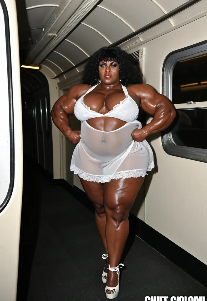 À african giant muscular chubby femalebodybuilder , housewife black woman BBW musclée , heavy weight bodybuildeuse géante et plantureuse with giant chest , imposante dame massive , beautiful make up Naomi Campbell face , in a train , avec de gros seins , énormes biceps musclés , in white transparent short mini nightgown with heels , exposant les seins , bras musclés exposés , dominante , jambes massives exposées , agressive , ,