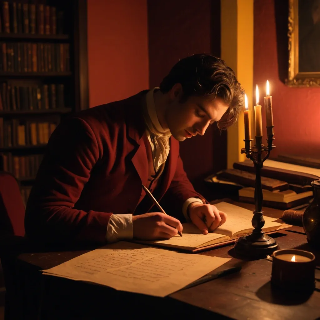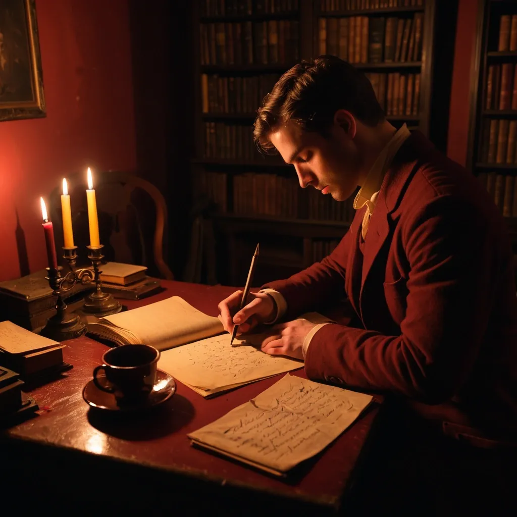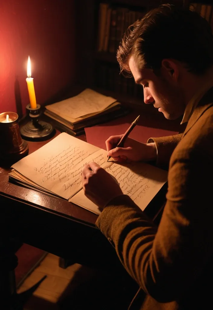 3: The Letter (1912): Aidan writes a passionate love letter to Liaandra in his dimly lit study. Focus on the intensity of his emotions and the weight of his words. Use strong shadows and warm candlelight to create a sense of intimacy and longing. Details: Intimate study , quill and ink , candlelight , heartfelt letter , intense emotions. Color Palette: Warm browns , deep reds , and soft yellows , with strong shadows. ,