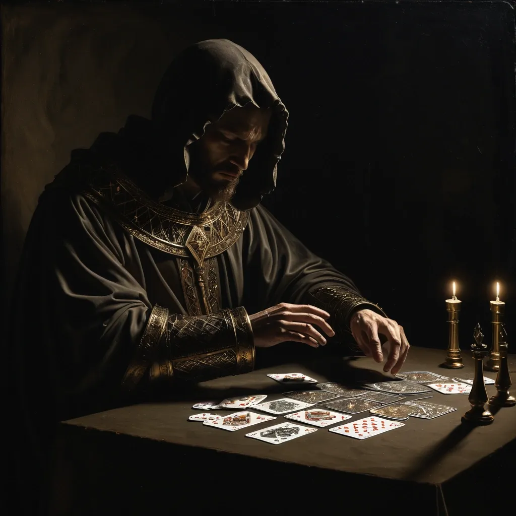 A lone figure , bathed in the ethereal glow of a spectral light , meticulously deals a deck of cards. Each card meticulously placed , revealing the sacred geometry of chance. Spades transform into gleaming swords , clubs morph into instruments of war , and diamonds shimmer with the promise of wealth , yet none of these symbols represent the true desires of his heart. His hands , skilled and deliberate , conceal a king , a king whose memory fades into the ephemeral. The scene unfolds in the moody , Caravaggesque chiaroscuro of a Rembrandt painting , with deep shadows and dramatic highlights that emphasize the psychological tension and hidden truths. The imagery evokes a narrative of anonymity and internal searching , a solitary contemplation of fate and identity , rendered in rich oils with an intense focus on form and composition. ar-9:16 ,