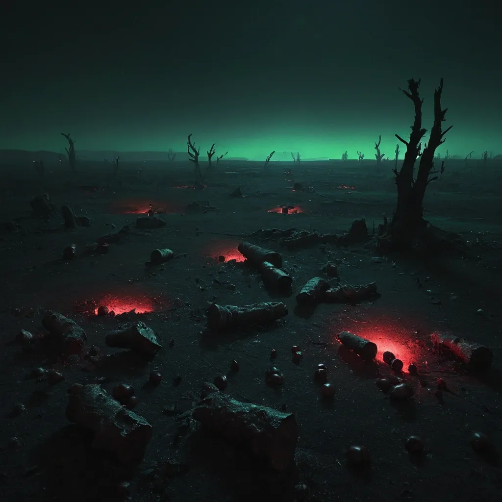 A petrified forest at night , bathed in the eerie glow of an ill wind and the distant lights of a passing milk train. Acorns lie scattered on the ground , remnants of what once was vibrant life. The scene evokes a sense of desolation and forgotten dreams , with a subtle hint of a dark , undertone in the viewer's implied imagination , inspired by the raw , expressive brushstrokes of Francis Bacon and the surreal vistas of Zdzisław Beksiński. The color palette is dark and moody , with pops of phosphorescent green and deep crimson. Cinematic lighting , volumetric fog , concept art. ar-9:16 ,