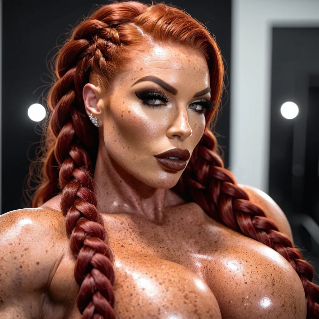 Generate Gorgeous female boss , bimbo , hourglass body , abnormally massive female bodybuilder , gorgeous , close up , full lips , big booty , redheaded , freckles on face and breast , braided design hair , feminine silhouette , too big breast , big booty , sexy thighs abs , silhouette , up close , flexing biceps , beautiful green eyes , legs are iconic and defining physical feature , both visually and in terms of combat ability.wearing an outfit that is a striking blend of elegance , power , and femininity , designed to command attention in any room. The suit is tailored to perfection , hugging the wearer’s curves with precision while emphasizing a structured silhouette. The fabric itself is a refined grey tweed patterned with subtle white grid lines , giving the suit a texture that feels both sophisticated and modern. The blazer features broad blue lapels and gold button accents , adding a luxurious touch that elevates the look beyond typical business attire. The matching high-waisted trousers elongate the frame , further enhancing the poised and commanding effect of the ensemble.The styling choices amplify the boldness of the suit. The inner blouse is a silky , greybutton-down shirt that complements the tweed’s tone while introducing a softer , feminine balance to the sharp tailoring of the jacket. The blouse peeks out neatly from under the blazer , maintaining elegance without drawing focus away from the suit’s commanding cut. Accessories are kept minimal yet intentional: a delicate layered gold necklace and hoop earrings that add glimmers of light and luxury without overpowering the outfit. The choice of voluminous , honey-brown braids cascading down her shoulders frames the face with both confidence and glamour , completing the commanding visual.Altogether , this look communicates a blend of authority and allure. It is business-ready yet fashion-forward , balancing corporate structure with vibrant femininity. The color palette blue , grey and gold avoids being overly delicate , instead embracing the richness of texture , structure , and presence. This is the kind of ensemble that speaks to ambition , sophistication , and personal style—ideal for someone who thrives in positions of influence but insists on expressing her individuality with bold elegance. It’s not just clothing—it’s a statement of power wrapped in grace. In luxury living legs that could crush a watermelon , skirt high boots are a bold and striking statement piece , crafted in glossy black patent leather that gives them a sleek , polished finish. Rising to just below the knee , the boots feature three adjustable buckle straps along the shaft , adding both edge and detail to their design. The towering stiletto heel , paired with a thick platform sole , creates an ultra-dramatic silhouette that elongates the leg and exudes power and confidence. With their combination of shine , height , and structure , these boots perfectly balance fierce femininity with high-fashion allure. Dark brown lip gloss ,