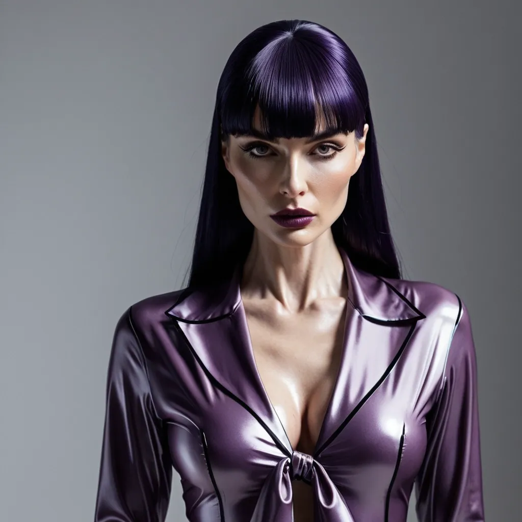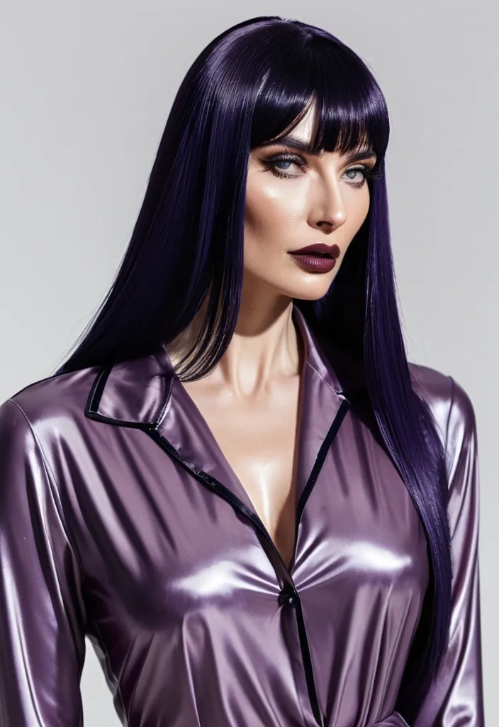 Her face carries a calm , slightly sulky beauty: smooth , oval contours with high cheekbones and a small , softly pointed chin. One violet eye is half-lidded in a lazy , almost bored squint while the other looks downward , giving her a cool , detached expression. Thin , elegant eyebrows arch gently above long lashes , and her small mouth rests in a faint , unimpressed pout that somehow still feels alluring rather than cold. . Her hair is long , straight , and a rich dark purple with a glossy sheen , falling past her shoulders in perfectly smooth strands. Straight-cut bangs frame her forehead and partially veil one eye , adding to her mysterious aura , while the rest cascades freely down her back and over one shoulder , catching subtle highlights that emphasize its silky texture. . She has an exaggerated hourglass figure dominated by an enormous , prominently displayed bust that strains dramatically against a tight , shiny mauve pajama top. The top features crisp white piping along the edges , a row of small black buttons down the front , and a thin black ribbon tied in a bow at the collar. The glossy fabric clings to every curve , reflecting soft light and accentuating her tiny waist. The background is a plain light gradient , keeping the focus entirely on her relaxed , low-angle pose and quietly confident presence. ,